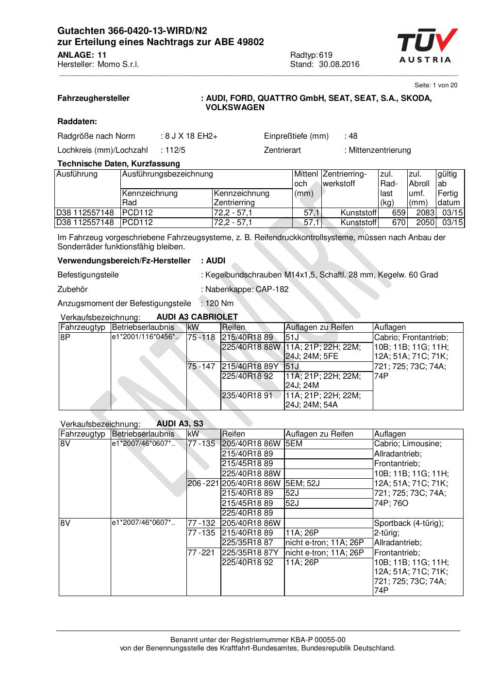 Felgengutachten / ABE für Alufelgen Momo QUANTUM (8Jx18 ET 0, Mittenloch 0 mm) mit KBA 49802 (Zertifikatsnummer 366-0420-13-WIRD/N2__Anlage_11). Hier kostenlos als PDF herunterladen. Der Download-Link ist 24 Stunden gültig und kann bis zu zwei Mal verwendet werden.