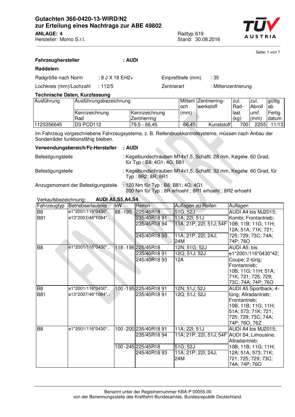 Felgengutachten / ABE für Alufelgen Momo QUANTUM (8Jx18 ET 0, Mittenloch 0 mm) mit KBA 49802 (Zertifikatsnummer 366-0420-13-WIRD/N2__Anlage_4). Hier kostenlos als PDF herunterladen. Der Download-Link ist 24 Stunden gültig und kann bis zu zwei Mal verwendet werden.