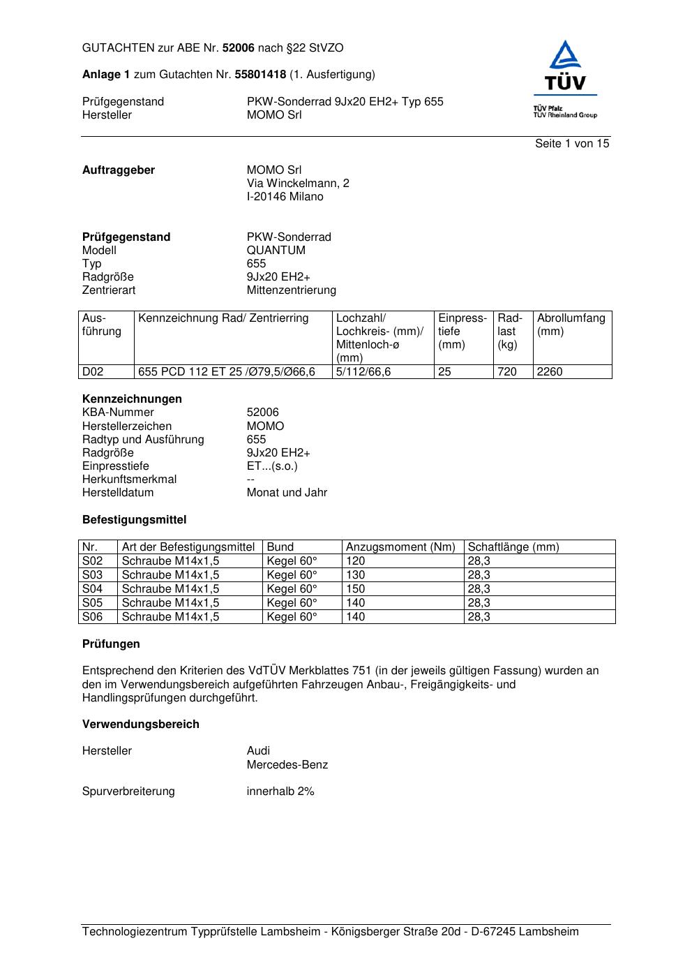 Felgengutachten / ABE für Alufelgen Momo QUANTUM (9Jx2 ET 0, Mittenloch 0 mm) mit KBA 52006 (Zertifikatsnummer 55801418__Anlage_1). Hier kostenlos als PDF herunterladen. Der Download-Link ist 24 Stunden gültig und kann bis zu zwei Mal verwendet werden.