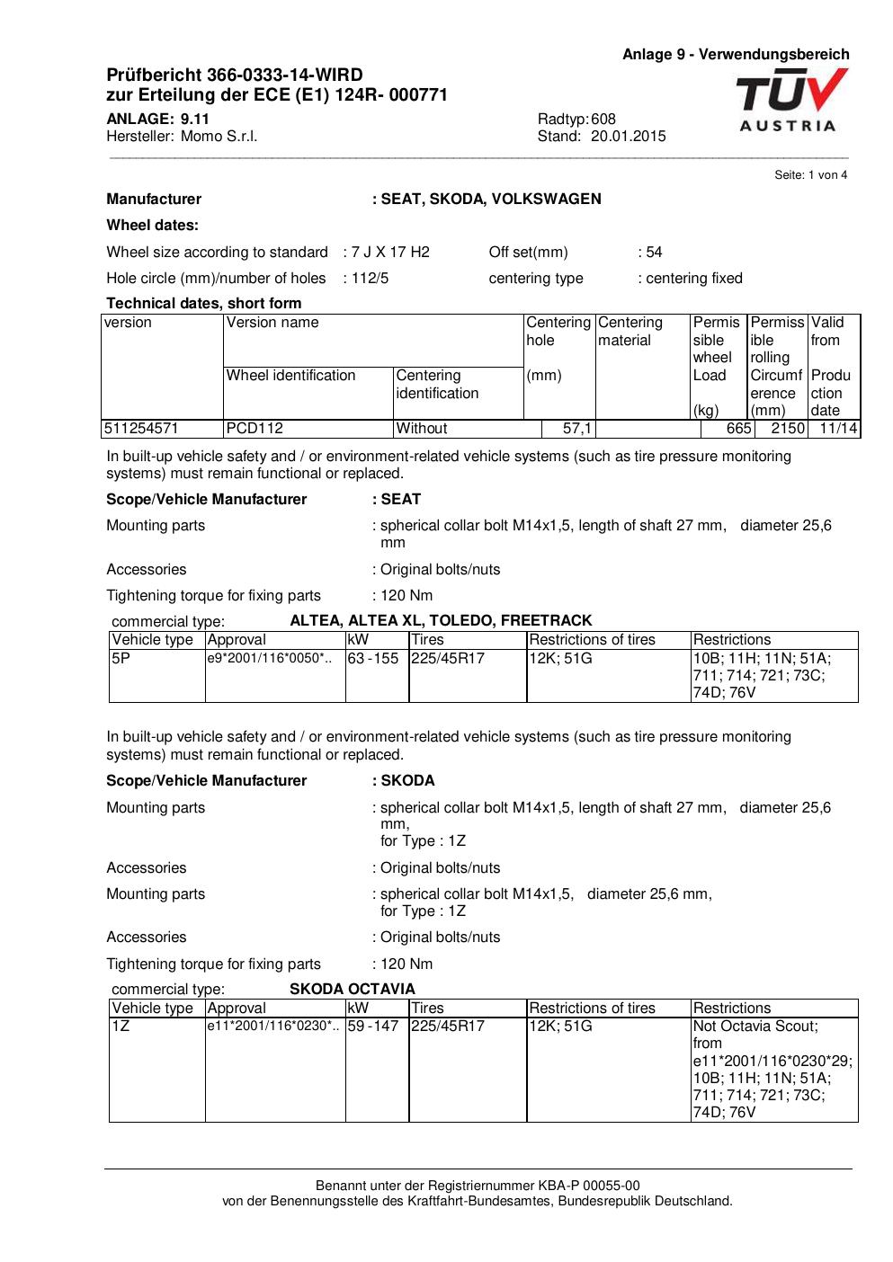 Felgengutachten / ECE für Alufelgen Momo REVENGE (7Jx17 ET 0, Mittenloch 0 mm) mit KBA 000771 (Zertifikatsnummer 366-0333-14-WIRD__Anlage_11). Hier kostenlos als PDF herunterladen. Der Download-Link ist 24 Stunden gültig und kann bis zu zwei Mal verwendet werden.