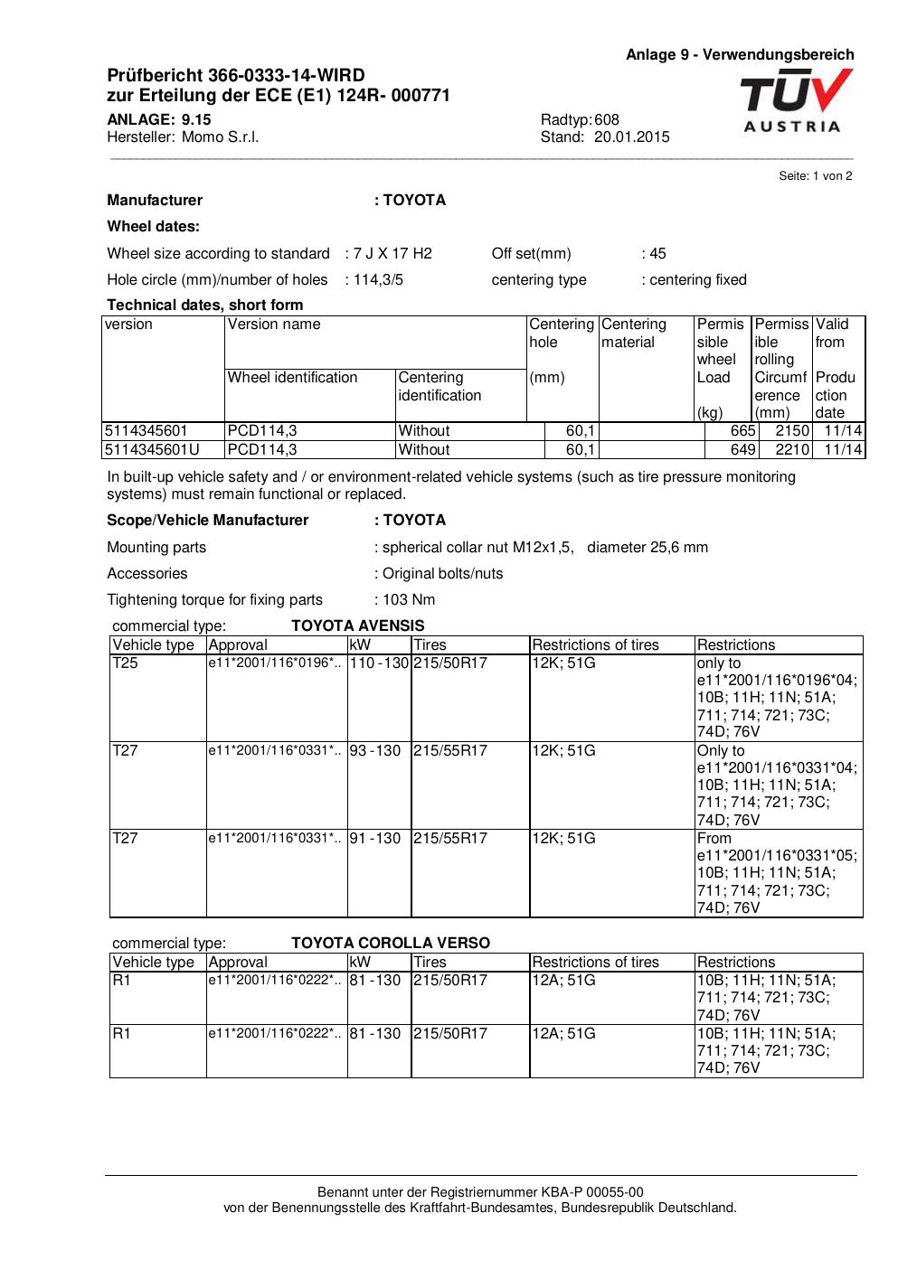 Felgengutachten / ECE für Alufelgen Momo REVENGE (7Jx17 ET 0, Mittenloch 0 mm) mit KBA 000771 (Zertifikatsnummer 366-0333-14-WIRD__Anlage_15). Hier kostenlos als PDF herunterladen. Der Download-Link ist 24 Stunden gültig und kann bis zu zwei Mal verwendet werden.