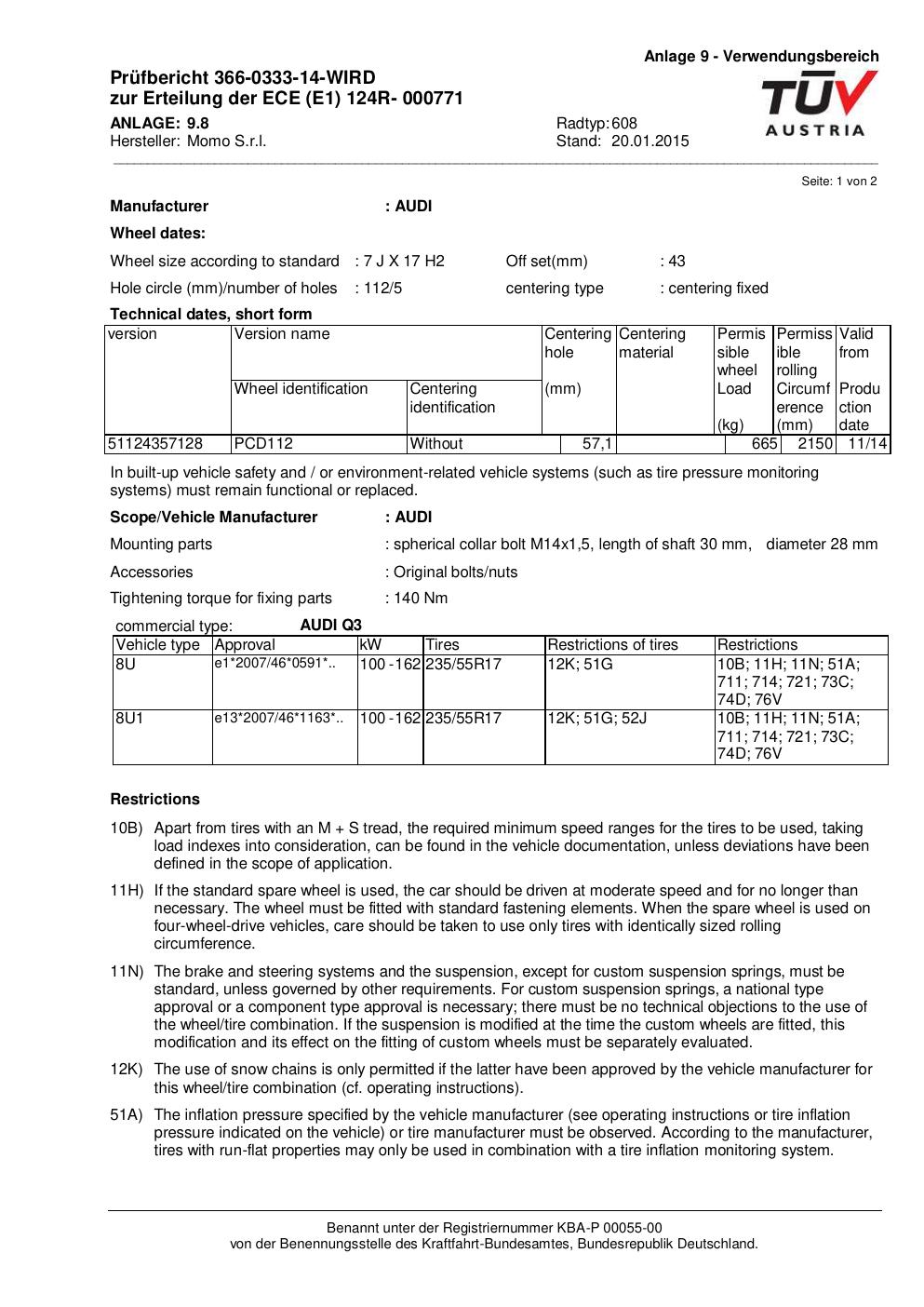 Felgengutachten / ECE für Alufelgen Momo REVENGE (7Jx17 ET 0, Mittenloch 0 mm) mit KBA 000771 (Zertifikatsnummer 366-0333-14-WIRD__Anlage_8). Hier kostenlos als PDF herunterladen. Der Download-Link ist 24 Stunden gültig und kann bis zu zwei Mal verwendet werden.