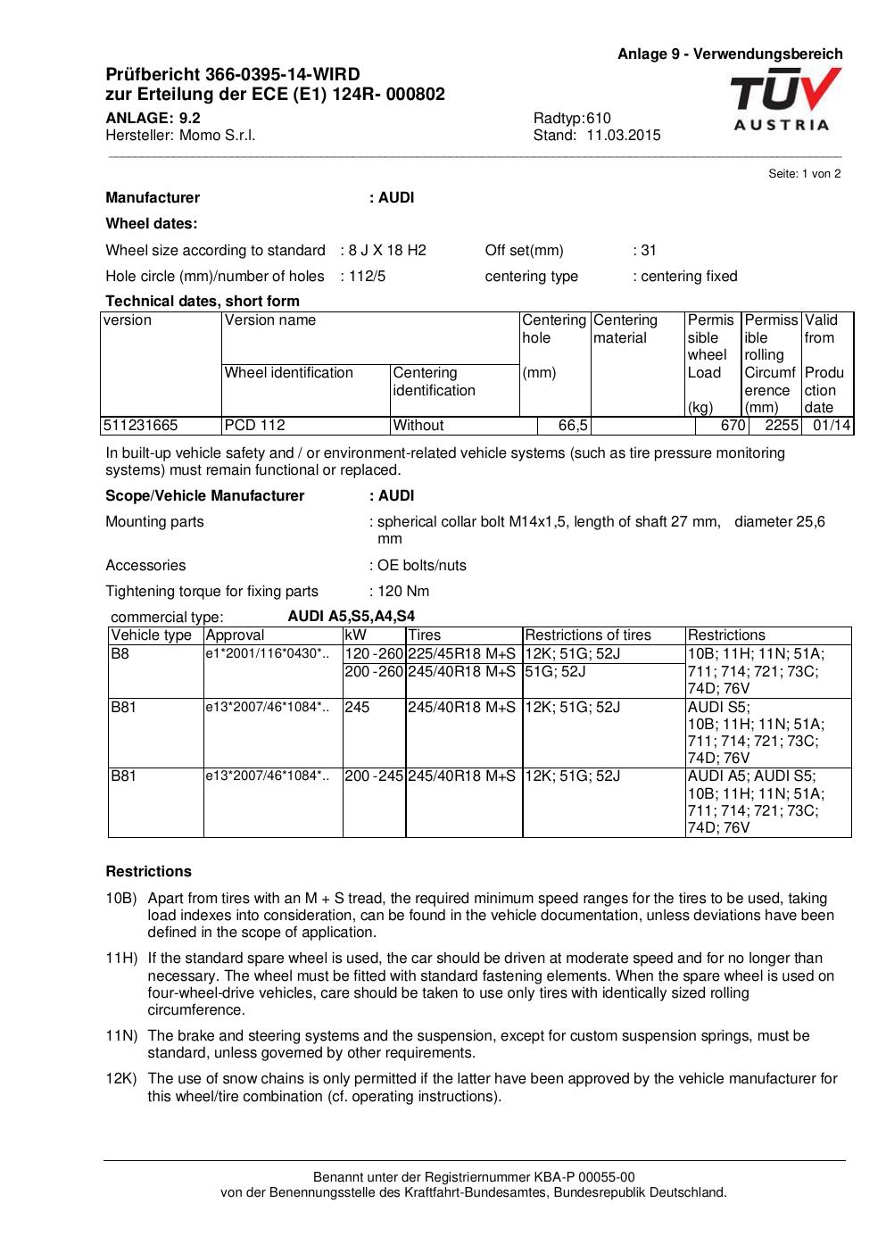Felgengutachten / ECE für Alufelgen Momo REVENGE (8Jx18 ET 0, Mittenloch 0 mm) mit KBA 000802 (Zertifikatsnummer 366-0395-14-WIRD__Anlage_2). Hier kostenlos als PDF herunterladen. Der Download-Link ist 24 Stunden gültig und kann bis zu zwei Mal verwendet werden.