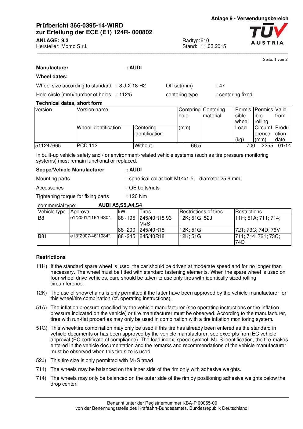 Felgengutachten / ECE für Alufelgen Momo REVENGE (8Jx18 ET 0, Mittenloch 0 mm) mit KBA 000802 (Zertifikatsnummer 366-0395-14-WIRD__Anlage_3). Hier kostenlos als PDF herunterladen. Der Download-Link ist 24 Stunden gültig und kann bis zu zwei Mal verwendet werden.