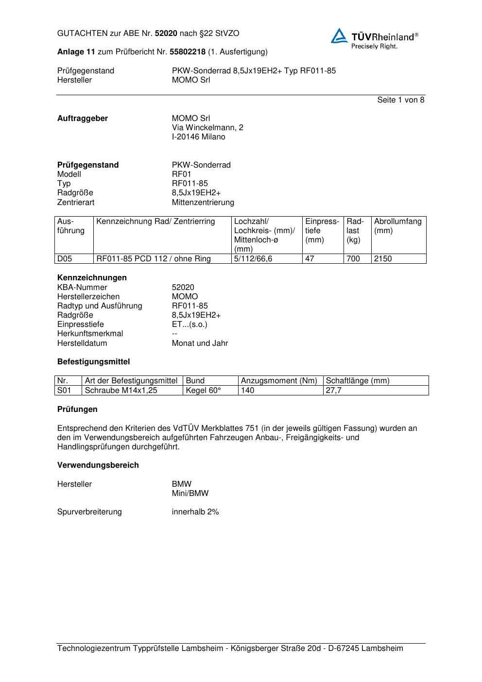 Dieses Gutachten (ABE) bezieht sich auf die Alufelge Momo RF01 in der Ausführung 8.5Jx19 ET 0, Mittenloch 0 mm (KBA 52020). Im PDF findest du typischerweise zulässige Reifengrößen, Auflagen/Anbauhinweise und – je nach Dokument – Hinweise zur Eintragung.