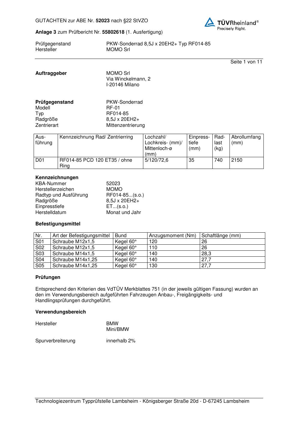 Felgengutachten / ABE für Alufelgen Momo RF01 (8.5Jx2 ET 0, Mittenloch 0 mm) mit KBA 52023 (Zertifikatsnummer 55802618__Anlage_3). Hier kostenlos als PDF herunterladen. Der Download-Link ist 24 Stunden gültig und kann bis zu zwei Mal verwendet werden.