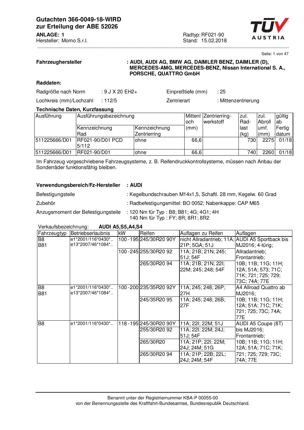 Felgengutachten / ABE für Alufelgen Momo RF02 (9Jx2 ET 0, Mittenloch 0 mm) mit KBA 52026 (Zertifikatsnummer 366-0049-18-WIRD__Anlage_1). Hier kostenlos als PDF herunterladen. Der Download-Link ist 24 Stunden gültig und kann bis zu zwei Mal verwendet werden.