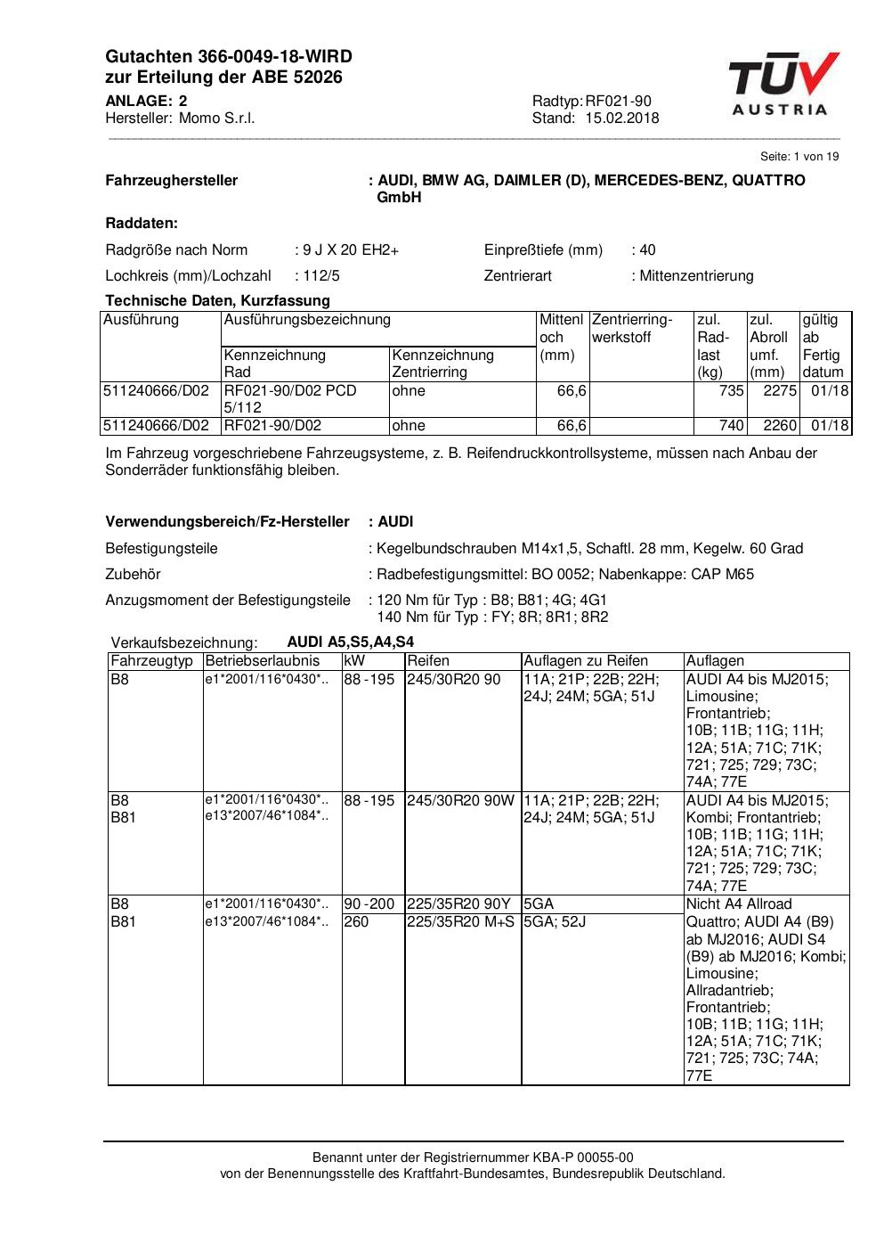 Felgengutachten / ABE für Alufelgen Momo RF02 (9Jx2 ET 0, Mittenloch 0 mm) mit KBA 52026 (Zertifikatsnummer 366-0049-18-WIRD__Anlage_2). Hier kostenlos als PDF herunterladen. Der Download-Link ist 24 Stunden gültig und kann bis zu zwei Mal verwendet werden.