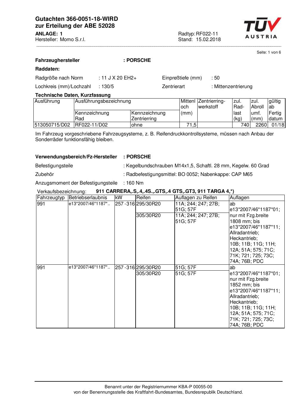 Felgengutachten / ABE für Alufelgen Momo RF02 (11Jx2 ET 0, Mittenloch 0 mm) mit KBA 52028 (Zertifikatsnummer 366-0051-18-WIRD__Anlage_1). Hier kostenlos als PDF herunterladen. Der Download-Link ist 24 Stunden gültig und kann bis zu zwei Mal verwendet werden.