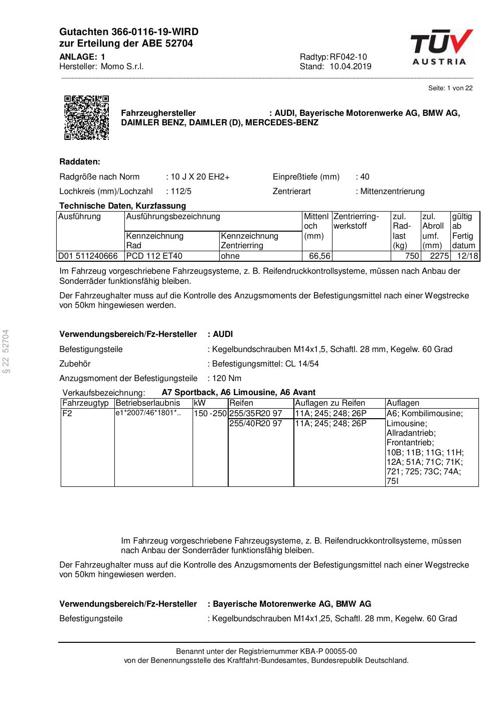 Felgengutachten / ABE für Alufelgen Momo RF04 (10Jx2 ET 0, Mittenloch 0 mm) mit KBA 52704 (Zertifikatsnummer 366-0116-19-WIRD__Anlage_1). Hier kostenlos als PDF herunterladen. Der Download-Link ist 24 Stunden gültig und kann bis zu zwei Mal verwendet werden.
