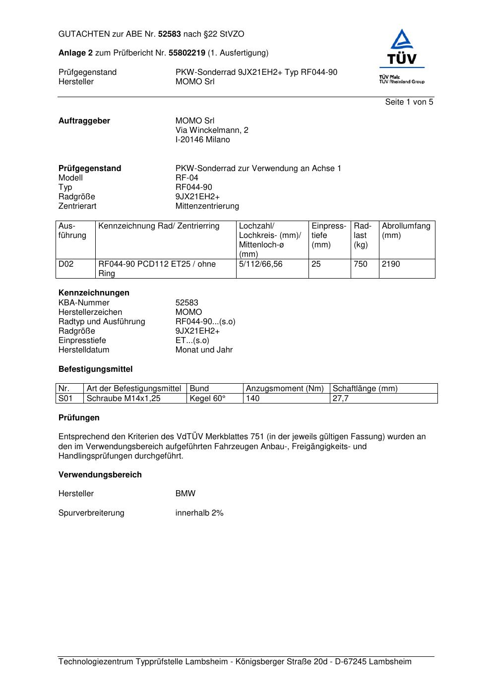Felgengutachten / ABE für Alufelgen Momo RF04 (9Jx21 ET 0, Mittenloch 0 mm) mit KBA 52583 (Zertifikatsnummer 55802219__Anlage_2). Hier kostenlos als PDF herunterladen. Der Download-Link ist 24 Stunden gültig und kann bis zu zwei Mal verwendet werden.