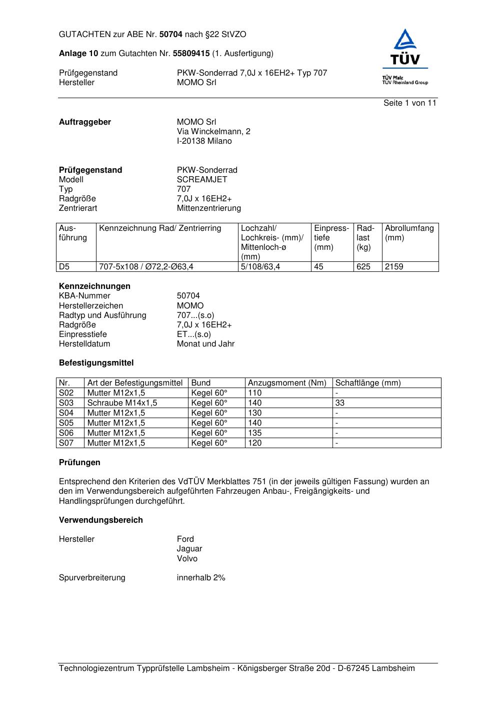 Felgengutachten / ABE für Alufelgen Momo SCREAMJET (7Jx16 ET 0, Mittenloch 0 mm) mit KBA 50704 (Zertifikatsnummer 55809415__Anlage_10). Hier kostenlos als PDF herunterladen. Der Download-Link ist 24 Stunden gültig und kann bis zu zwei Mal verwendet werden.