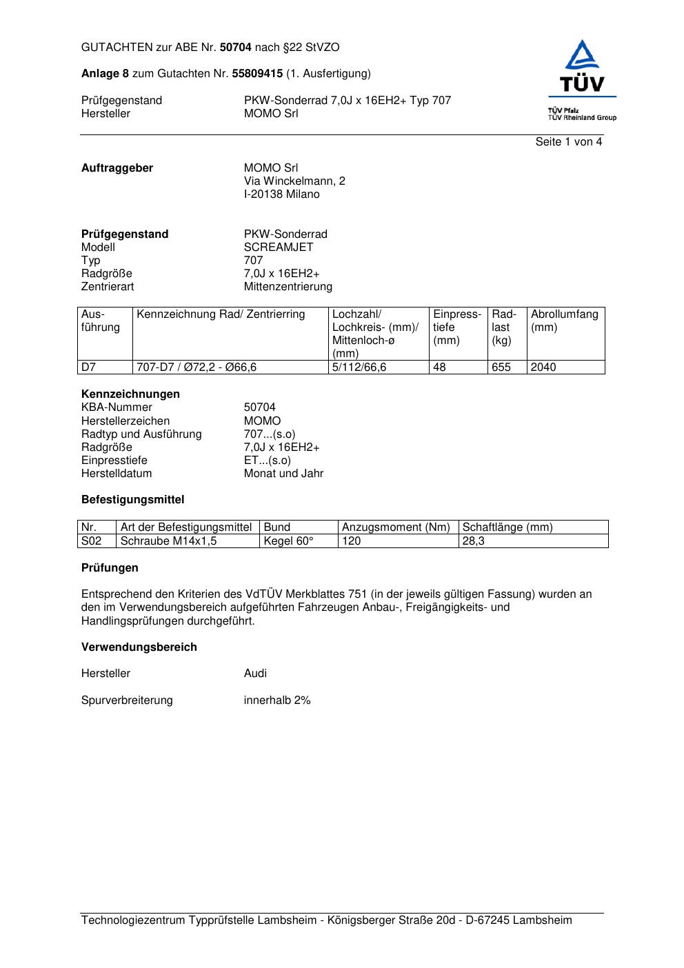 Felgengutachten / ABE für Alufelgen Momo SCREAMJET (7Jx16 ET 0, Mittenloch 0 mm) mit KBA 50704 (Zertifikatsnummer 55809415__Anlage_8). Hier kostenlos als PDF herunterladen. Der Download-Link ist 24 Stunden gültig und kann bis zu zwei Mal verwendet werden.