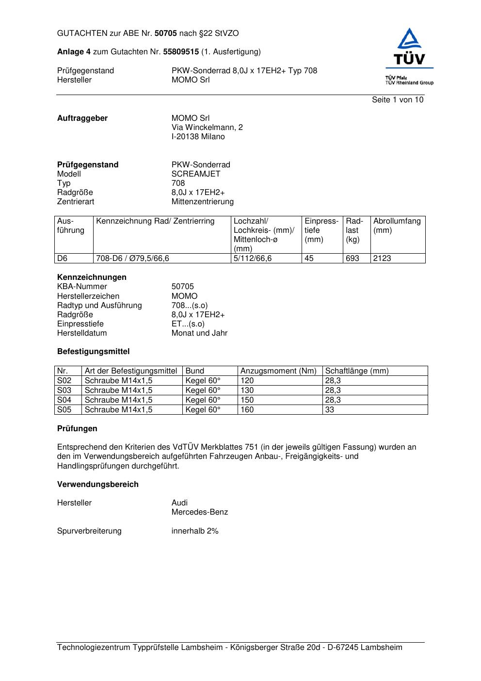 Felgengutachten / ABE für Alufelgen Momo SCREAMJET (8Jx17 ET 0, Mittenloch 0 mm) mit KBA 50705 (Zertifikatsnummer 55809515__Anlage_4). Hier kostenlos als PDF herunterladen. Der Download-Link ist 24 Stunden gültig und kann bis zu zwei Mal verwendet werden.