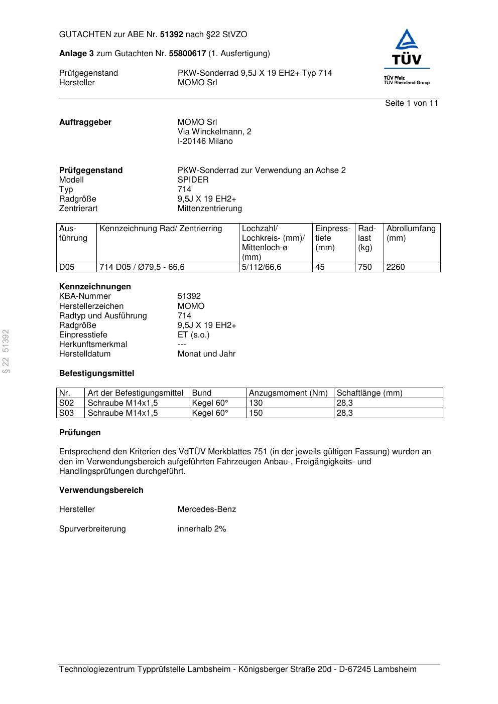Felgengutachten / ABE für Alufelgen Momo SPIDER (9.5Jx19 ET 0, Mittenloch 0 mm) mit KBA 51392 (Zertifikatsnummer 55800617__Anlage_3). Hier kostenlos als PDF herunterladen. Der Download-Link ist 24 Stunden gültig und kann bis zu zwei Mal verwendet werden.