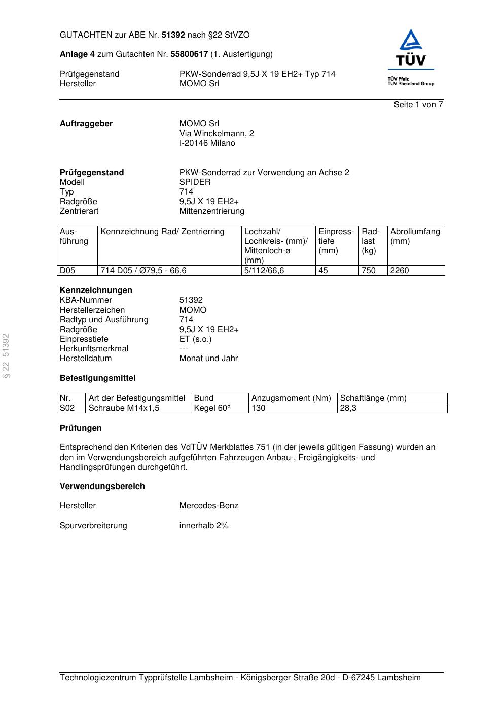 Felgengutachten / ABE für Alufelgen Momo SPIDER (9.5Jx19 ET 0, Mittenloch 0 mm) mit KBA 51392 (Zertifikatsnummer 55800617__Anlage_4). Hier kostenlos als PDF herunterladen. Der Download-Link ist 24 Stunden gültig und kann bis zu zwei Mal verwendet werden.
