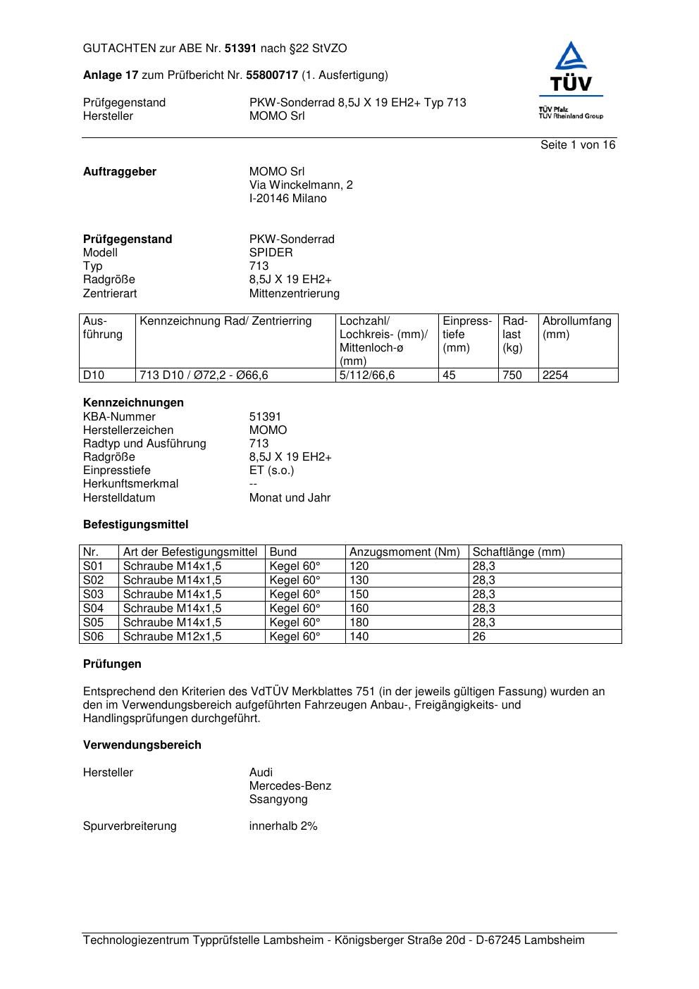 Felgengutachten / ABE für Alufelgen Momo SPIDER (8.5Jx19 ET 0, Mittenloch 0 mm) mit KBA 51391 (Zertifikatsnummer 55800717__Anlage_17). Hier kostenlos als PDF herunterladen. Der Download-Link ist 24 Stunden gültig und kann bis zu zwei Mal verwendet werden.
