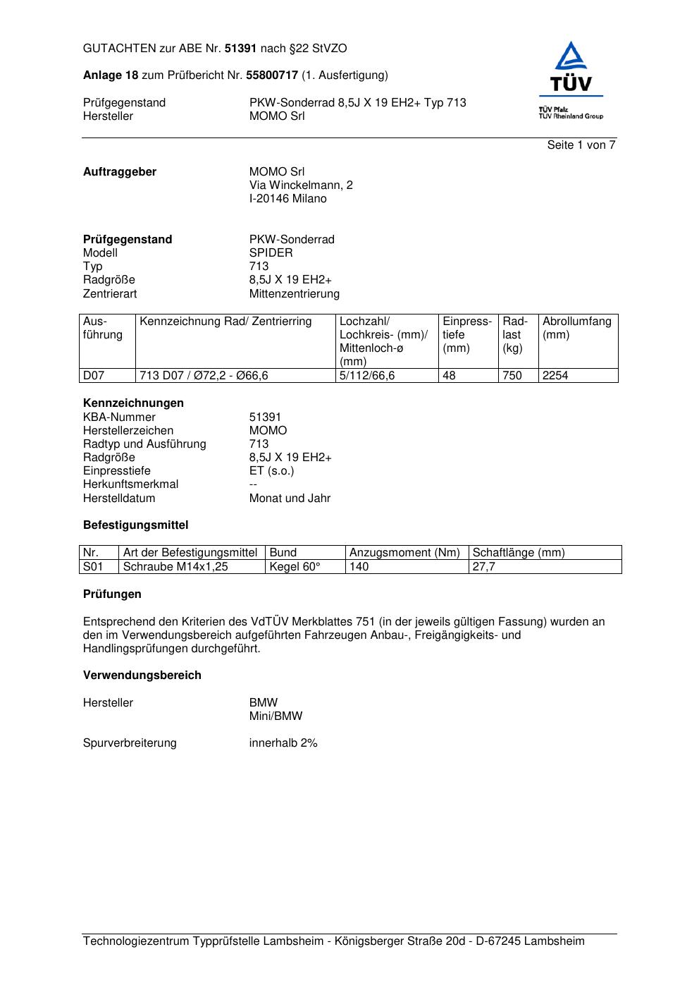 Felgengutachten / ABE für Alufelgen Momo SPIDER (8.5Jx19 ET 0, Mittenloch 0 mm) mit KBA 51391 (Zertifikatsnummer 55800717__Anlage_18). Hier kostenlos als PDF herunterladen. Der Download-Link ist 24 Stunden gültig und kann bis zu zwei Mal verwendet werden.