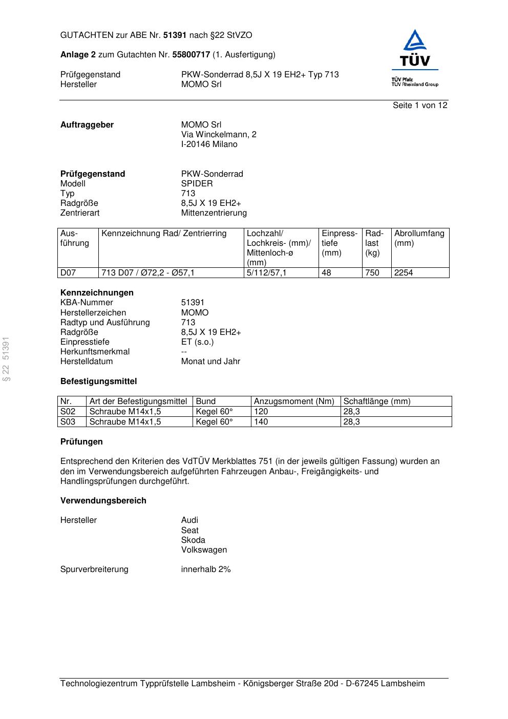 Felgengutachten / ABE für Alufelgen Momo SPIDER (8.5Jx19 ET 0, Mittenloch 0 mm) mit KBA 51391 (Zertifikatsnummer 55800717__Anlage_2). Hier kostenlos als PDF herunterladen. Der Download-Link ist 24 Stunden gültig und kann bis zu zwei Mal verwendet werden.