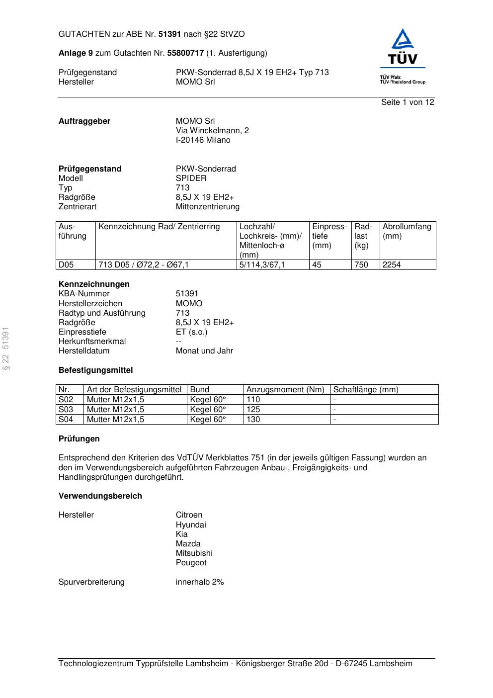 Dieses ABE gehört zur Felge Momo SPIDER in 8.5Jx19 ET0 mit KBA 51391. Die Seite ist dafür gedacht, dass du schnell prüfen kannst, ob KBA, Design und Größe zu deiner Felge passen und danach direkt das richtige PDF lädst.