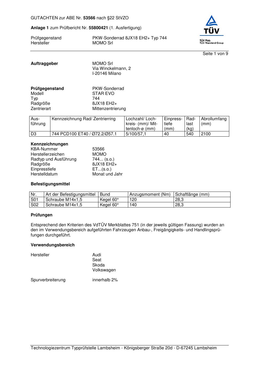 Felgengutachten / ABE für Alufelgen Momo STAR (8Jx18 ET 0, Mittenloch 0 mm) mit KBA 53566 (Zertifikatsnummer 55800421__Anlage_1). Hier kostenlos als PDF herunterladen. Der Download-Link ist 24 Stunden gültig und kann bis zu zwei Mal verwendet werden.