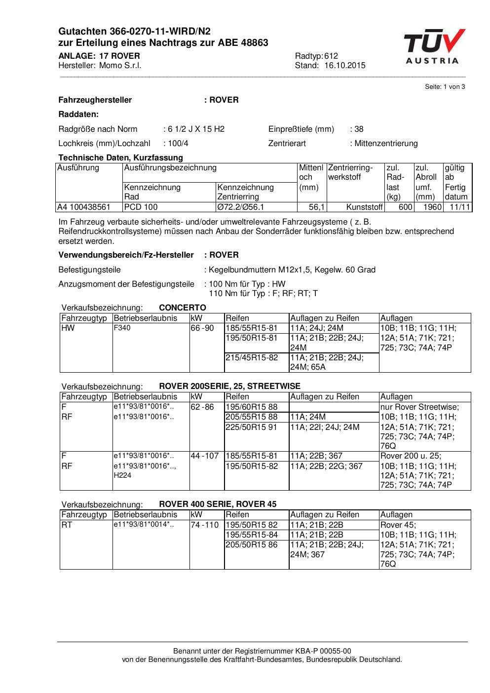 Felgengutachten / ABE für Alufelgen Momo WIN_PRO (6.5Jx15 ET 0, Mittenloch 0 mm) mit KBA 48863 (Zertifikatsnummer 366-0270-11-WIRD/N2__Anlage_17). Hier kostenlos als PDF herunterladen. Der Download-Link ist 24 Stunden gültig und kann bis zu zwei Mal verwendet werden.