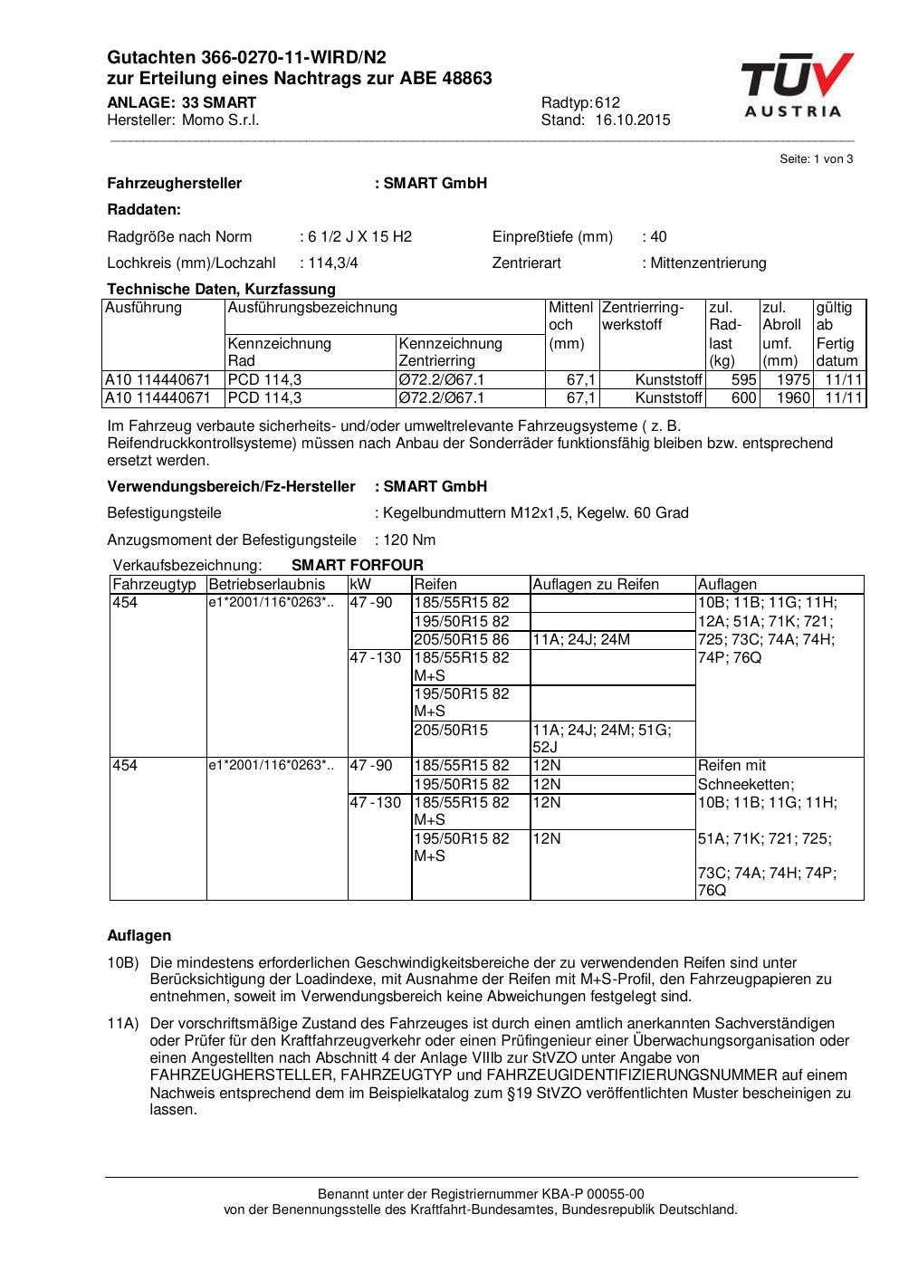 Dieses Gutachten (ABE) bezieht sich auf die Alufelge Momo WIN_PRO in der Ausführung 6.5Jx15 ET 0, Mittenloch 0 mm (KBA 48863). Im PDF findest du typischerweise zulässige Reifengrößen, Auflagen/Anbauhinweise und – je nach Dokument – Hinweise zur Eintragung.