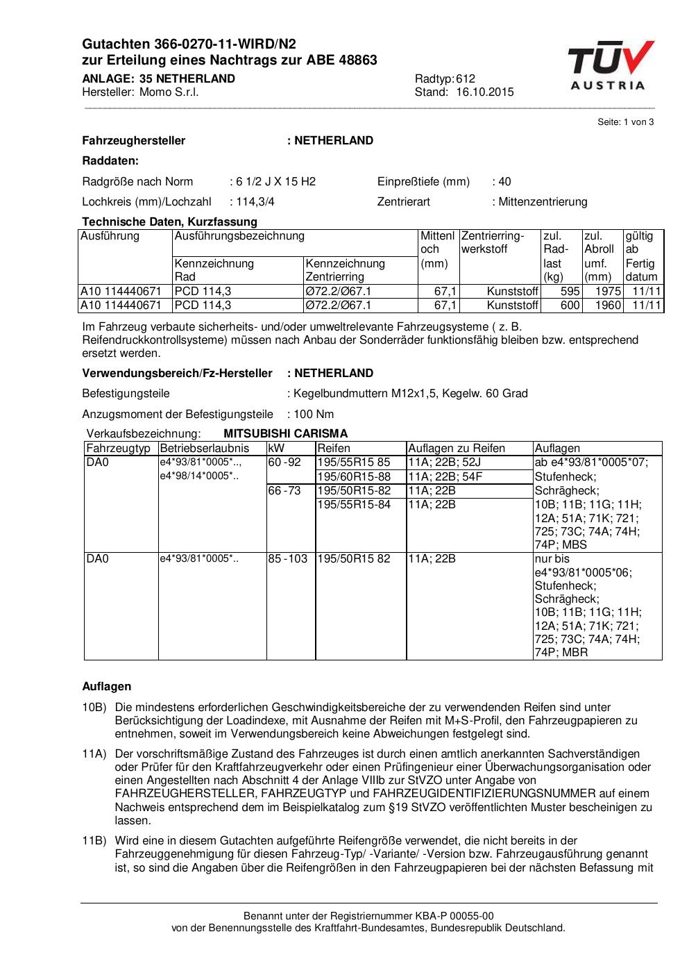 Felgengutachten / ABE für Alufelgen Momo WIN_PRO (6.5Jx15 ET 0, Mittenloch 0 mm) mit KBA 48863 (Zertifikatsnummer 366-0270-11-WIRD/N2__Anlage_35). Hier kostenlos als PDF herunterladen. Der Download-Link ist 24 Stunden gültig und kann bis zu zwei Mal verwendet werden.