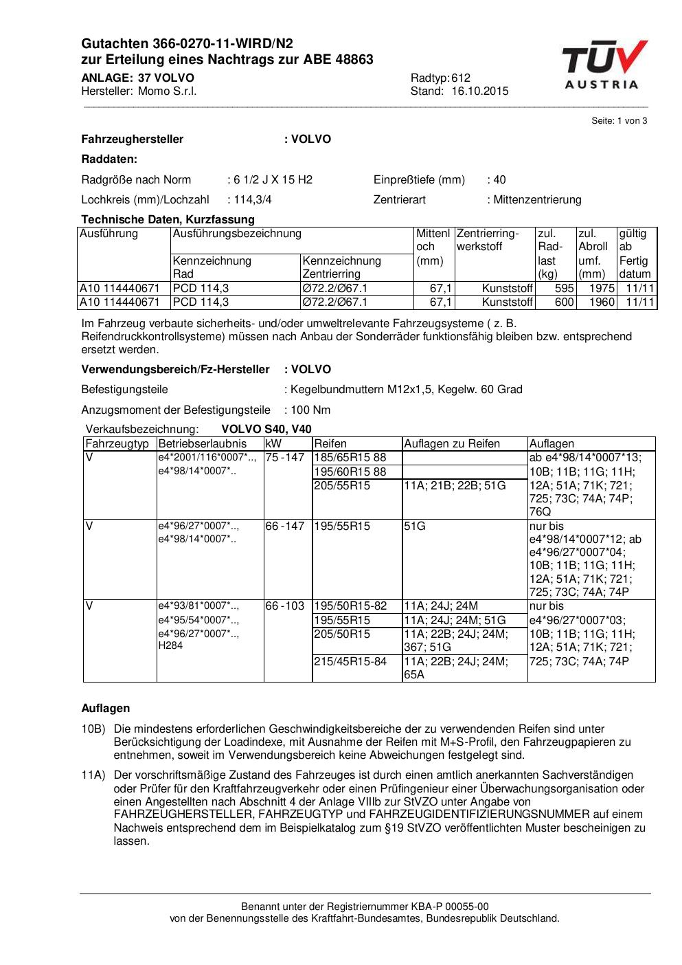 Felgengutachten / ABE für Alufelgen Momo WIN_PRO (6.5Jx15 ET 0, Mittenloch 0 mm) mit KBA 48863 (Zertifikatsnummer 366-0270-11-WIRD/N2__Anlage_37). Hier kostenlos als PDF herunterladen. Der Download-Link ist 24 Stunden gültig und kann bis zu zwei Mal verwendet werden.