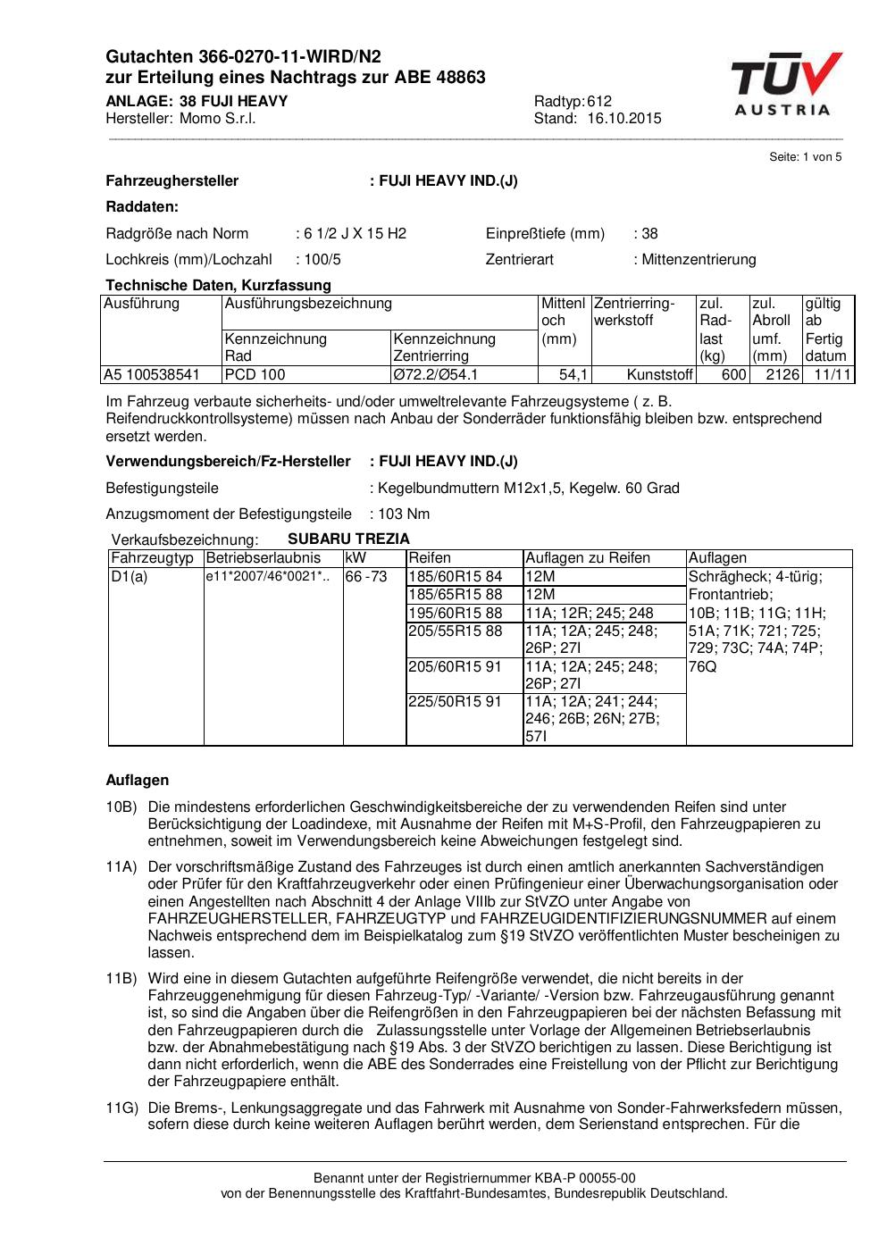Felgengutachten / ABE für Alufelgen Momo WIN_PRO (6.5Jx15 ET 0, Mittenloch 0 mm) mit KBA 48863 (Zertifikatsnummer 366-0270-11-WIRD/N2__Anlage_38). Hier kostenlos als PDF herunterladen. Der Download-Link ist 24 Stunden gültig und kann bis zu zwei Mal verwendet werden.