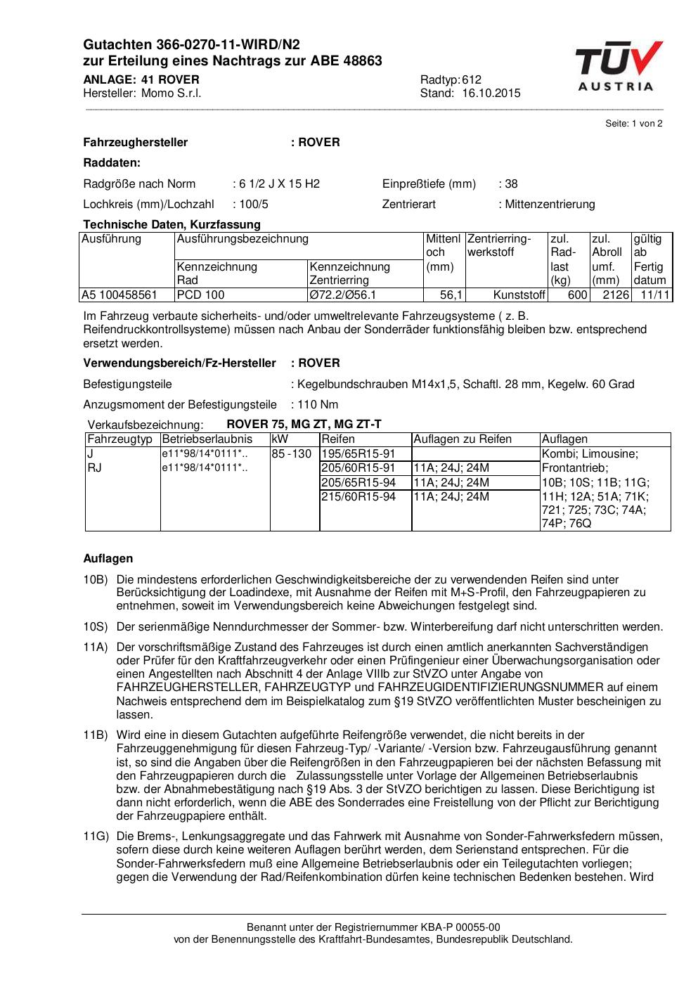 Dieses ABE gehört zur Felge Momo WIN_PRO in 6.5Jx15 ET0 mit KBA 48863. Die Seite ist dafür gedacht, dass du schnell prüfen kannst, ob KBA, Design und Größe zu deiner Felge passen und danach direkt das richtige PDF lädst.
