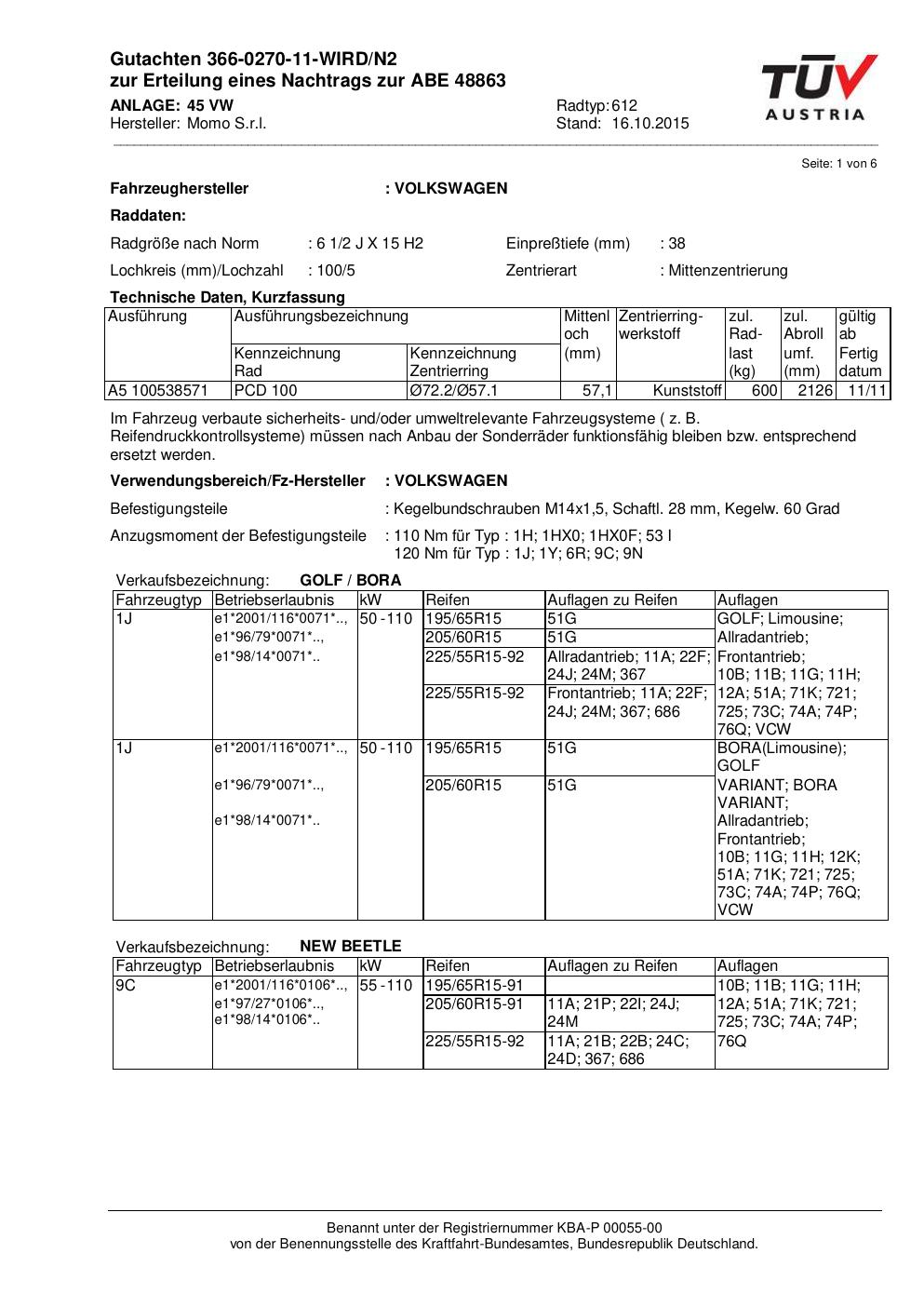 Felgengutachten / ABE für Alufelgen Momo WIN_PRO (6.5Jx15 ET 0, Mittenloch 0 mm) mit KBA 48863 (Zertifikatsnummer 366-0270-11-WIRD/N2__Anlage_45). Hier kostenlos als PDF herunterladen. Der Download-Link ist 24 Stunden gültig und kann bis zu zwei Mal verwendet werden.