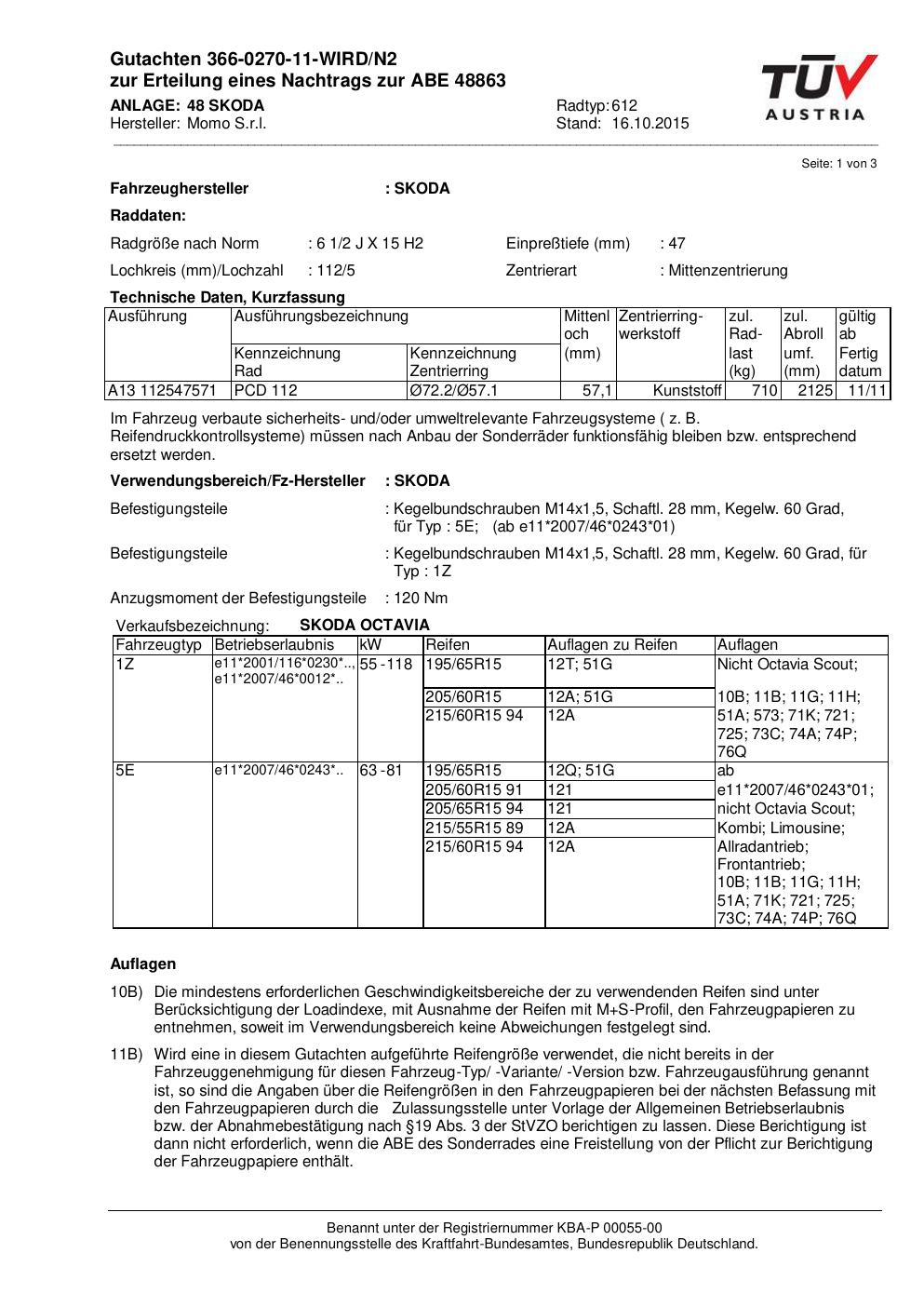 Felgengutachten / ABE für Alufelgen Momo WIN_PRO (6.5Jx15 ET 0, Mittenloch 0 mm) mit KBA 48863 (Zertifikatsnummer 366-0270-11-WIRD/N2__Anlage_48). Hier kostenlos als PDF herunterladen. Der Download-Link ist 24 Stunden gültig und kann bis zu zwei Mal verwendet werden.
