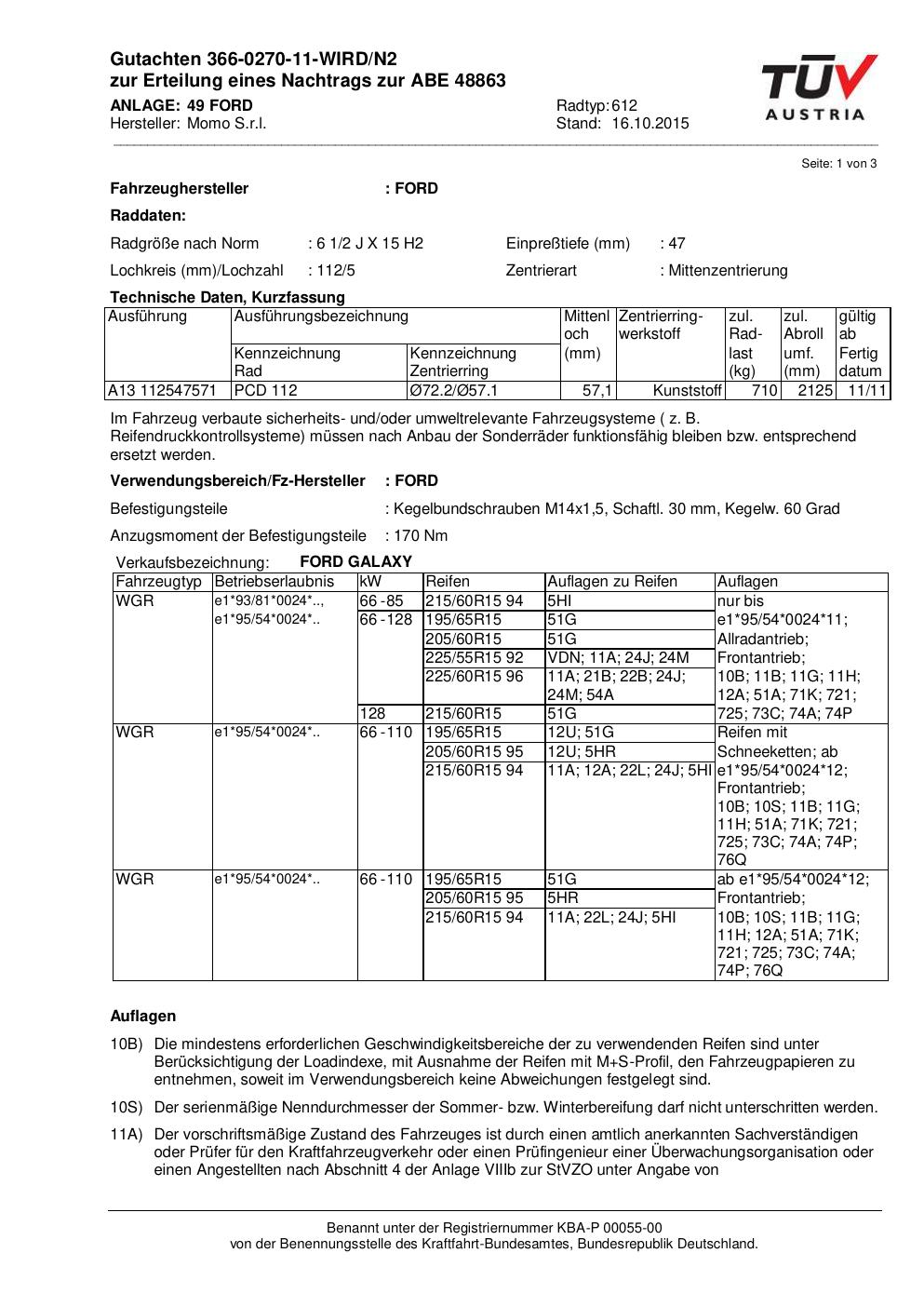 • Stimmt die KBA-Nummer auf der Felge mit diesem Dokument überein?