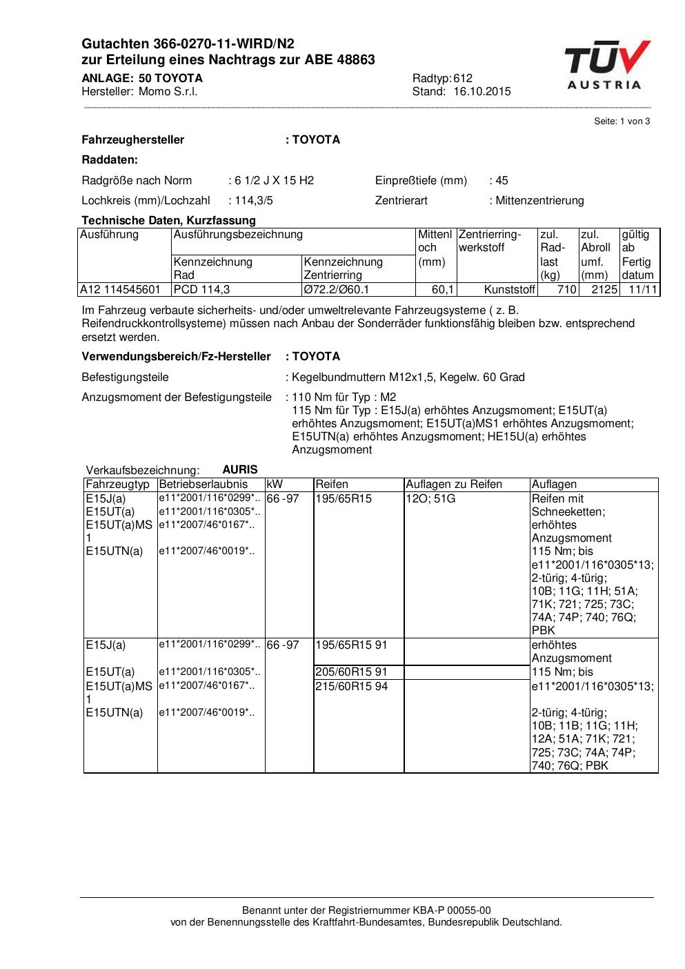 Dieses Gutachten (ABE) bezieht sich auf die Alufelge Momo WIN_PRO in der Ausführung 6.5Jx15 ET 0, Mittenloch 0 mm (KBA 48863). Im PDF findest du typischerweise zulässige Reifengrößen, Auflagen/Anbauhinweise und – je nach Dokument – Hinweise zur Eintragung.