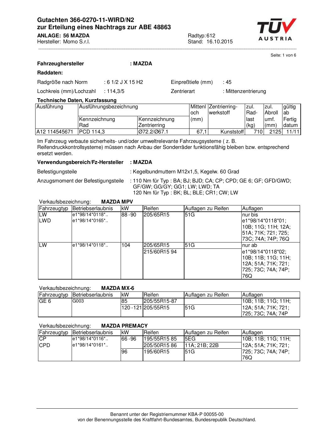Felgengutachten / ABE für Alufelgen Momo WIN_PRO (6.5Jx15 ET 0, Mittenloch 0 mm) mit KBA 48863 (Zertifikatsnummer 366-0270-11-WIRD/N2__Anlage_56). Hier kostenlos als PDF herunterladen. Der Download-Link ist 24 Stunden gültig und kann bis zu zwei Mal verwendet werden.