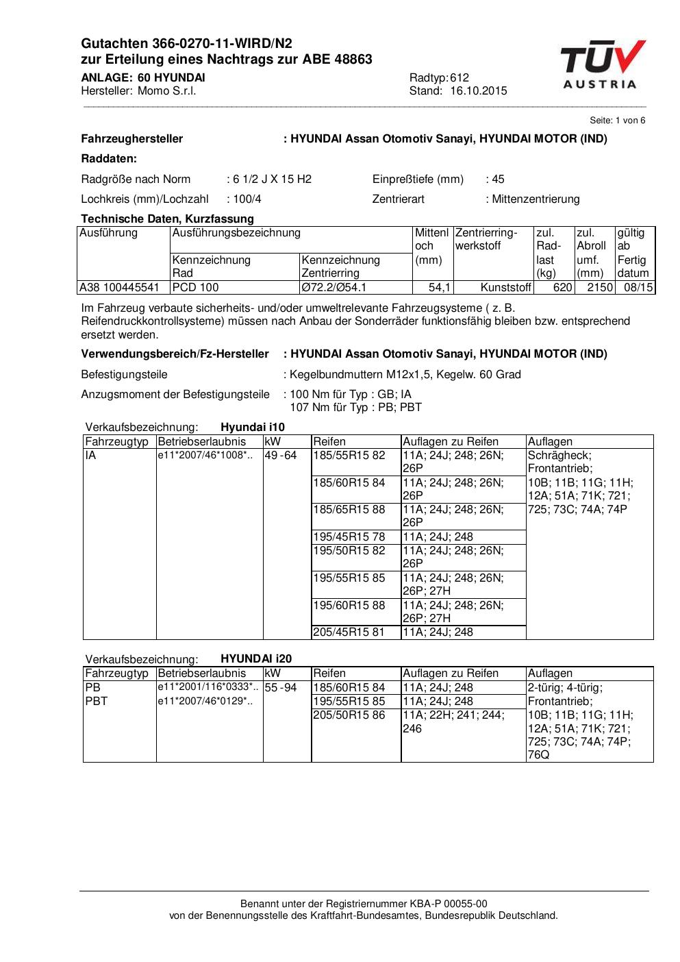 Dieses Gutachten (ABE) bezieht sich auf die Alufelge Momo WIN_PRO in der Ausführung 6.5Jx15 ET 0, Mittenloch 0 mm (KBA 48863). Im PDF findest du typischerweise zulässige Reifengrößen, Auflagen/Anbauhinweise und – je nach Dokument – Hinweise zur Eintragung.