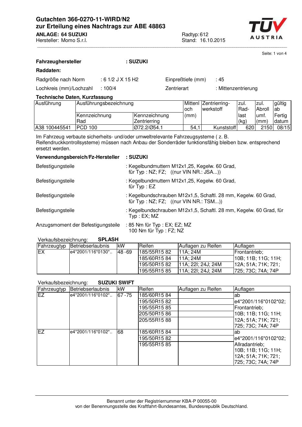 Felgengutachten / ABE für Alufelgen Momo WIN_PRO (6.5Jx15 ET 0, Mittenloch 0 mm) mit KBA 48863 (Zertifikatsnummer 366-0270-11-WIRD/N2__Anlage_64). Hier kostenlos als PDF herunterladen. Der Download-Link ist 24 Stunden gültig und kann bis zu zwei Mal verwendet werden.