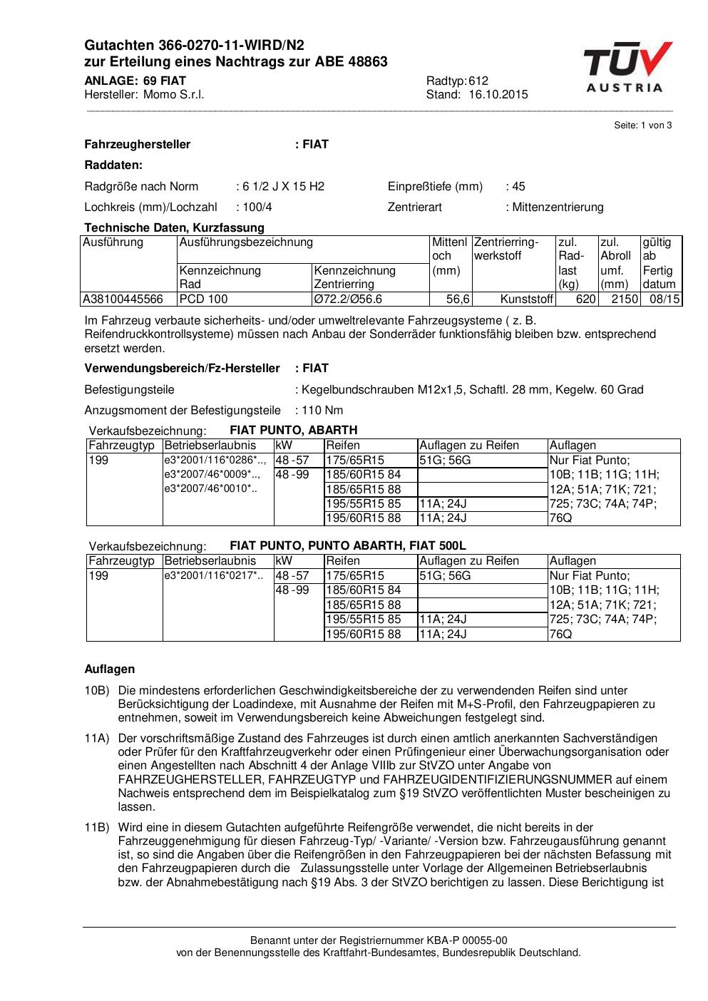 Felgengutachten / ABE für Alufelgen Momo WIN_PRO (6.5Jx15 ET 0, Mittenloch 0 mm) mit KBA 48863 (Zertifikatsnummer 366-0270-11-WIRD/N2__Anlage_69). Hier kostenlos als PDF herunterladen. Der Download-Link ist 24 Stunden gültig und kann bis zu zwei Mal verwendet werden.