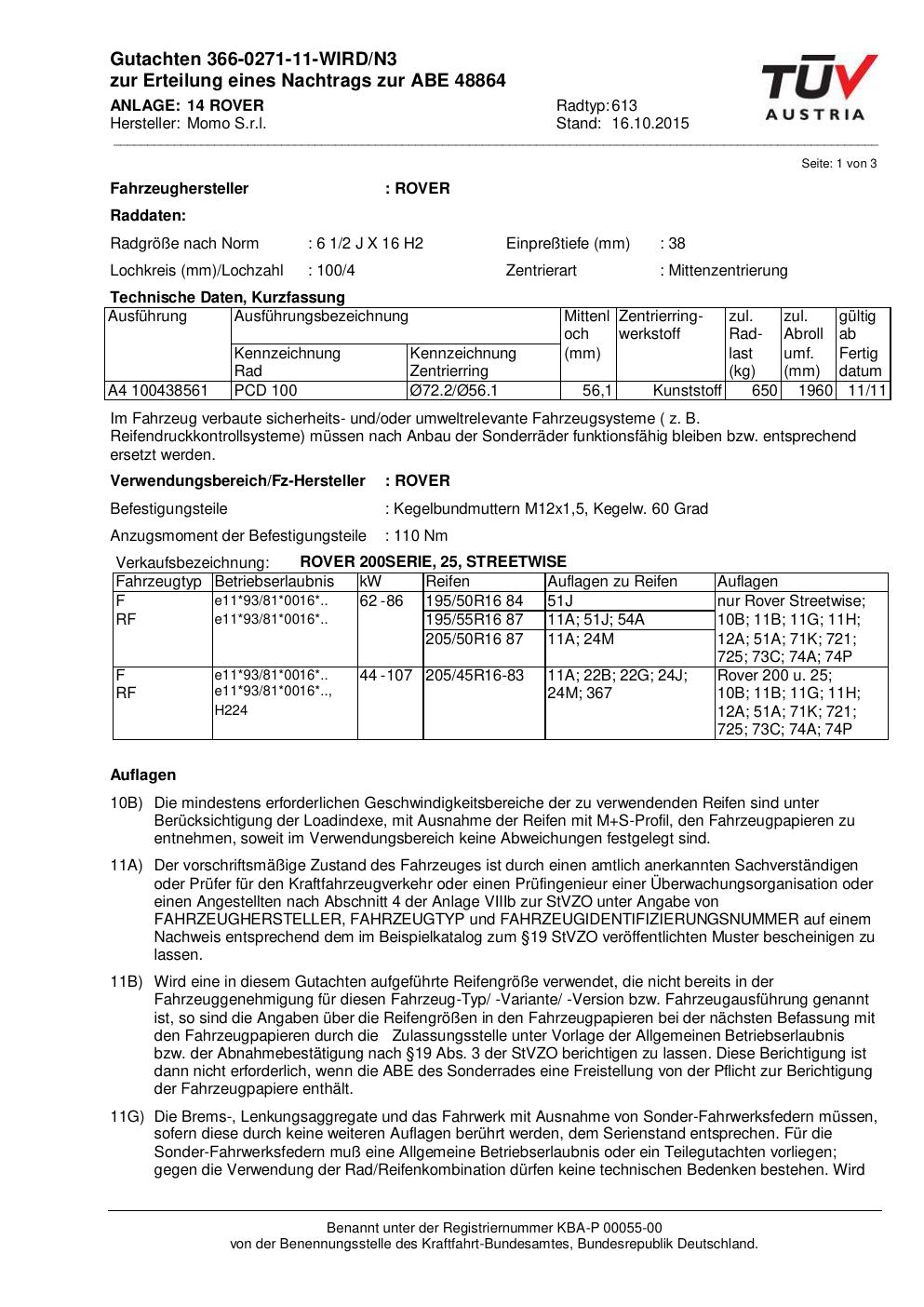 Felgengutachten / ABE für Alufelgen Momo WIN_PRO (6.5Jx16 ET 0, Mittenloch 0 mm) mit KBA 48864 (Zertifikatsnummer 366-0271-11-WIRD/N3__Anlage_14). Hier kostenlos als PDF herunterladen. Der Download-Link ist 24 Stunden gültig und kann bis zu zwei Mal verwendet werden.