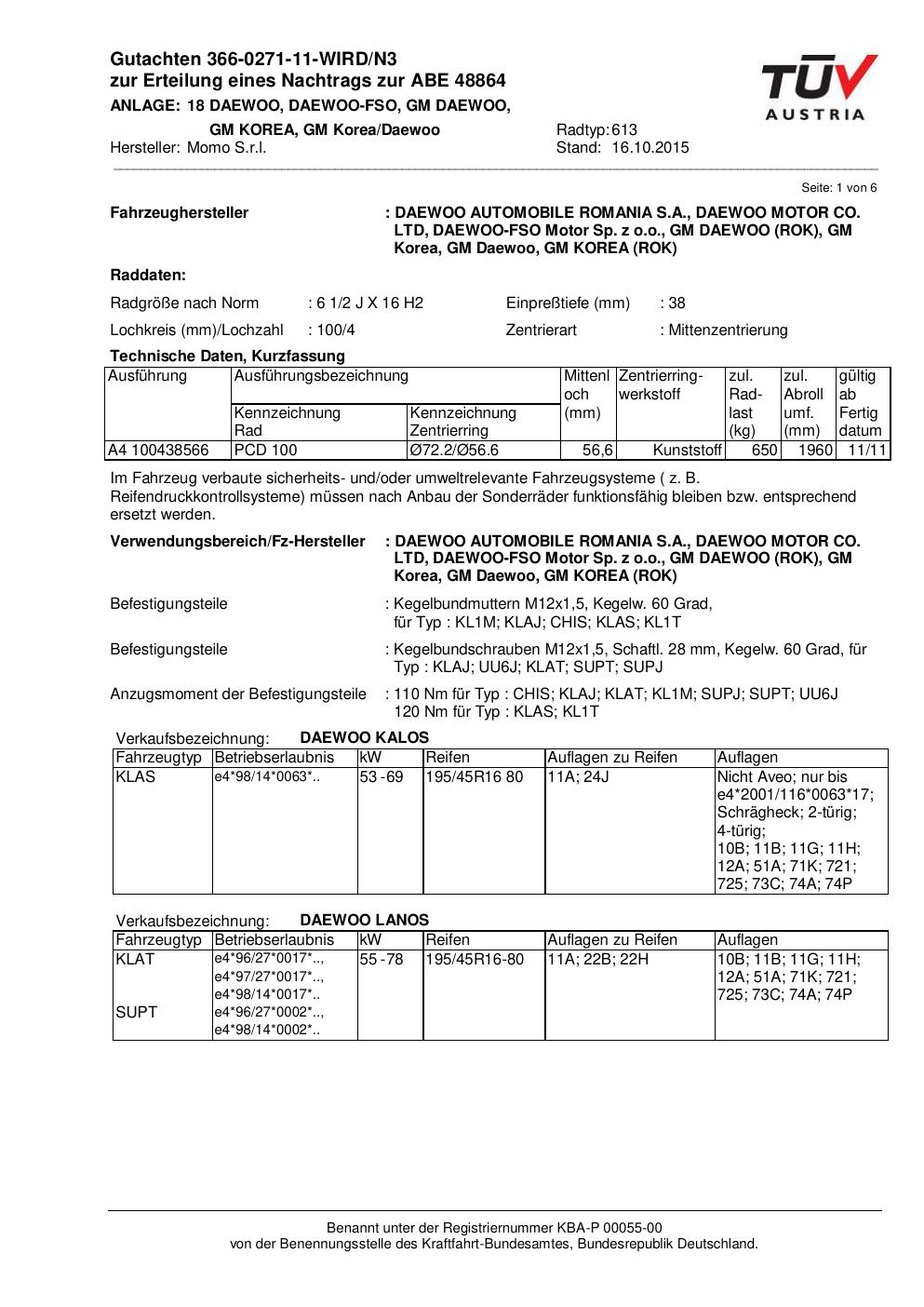 Felgengutachten / ABE für Alufelgen Momo WIN_PRO (6.5Jx16 ET 0, Mittenloch 0 mm) mit KBA 48864 (Zertifikatsnummer 366-0271-11-WIRD/N3__Anlage_18). Hier kostenlos als PDF herunterladen. Der Download-Link ist 24 Stunden gültig und kann bis zu zwei Mal verwendet werden.