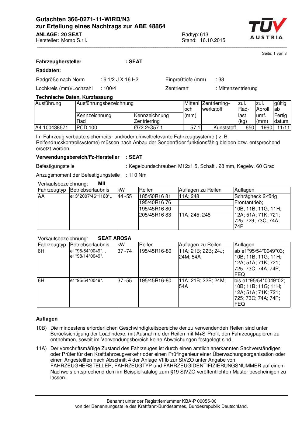 Felgengutachten / ABE für Alufelgen Momo WIN_PRO (6.5Jx16 ET 0, Mittenloch 0 mm) mit KBA 48864 (Zertifikatsnummer 366-0271-11-WIRD/N3__Anlage_20). Hier kostenlos als PDF herunterladen. Der Download-Link ist 24 Stunden gültig und kann bis zu zwei Mal verwendet werden.