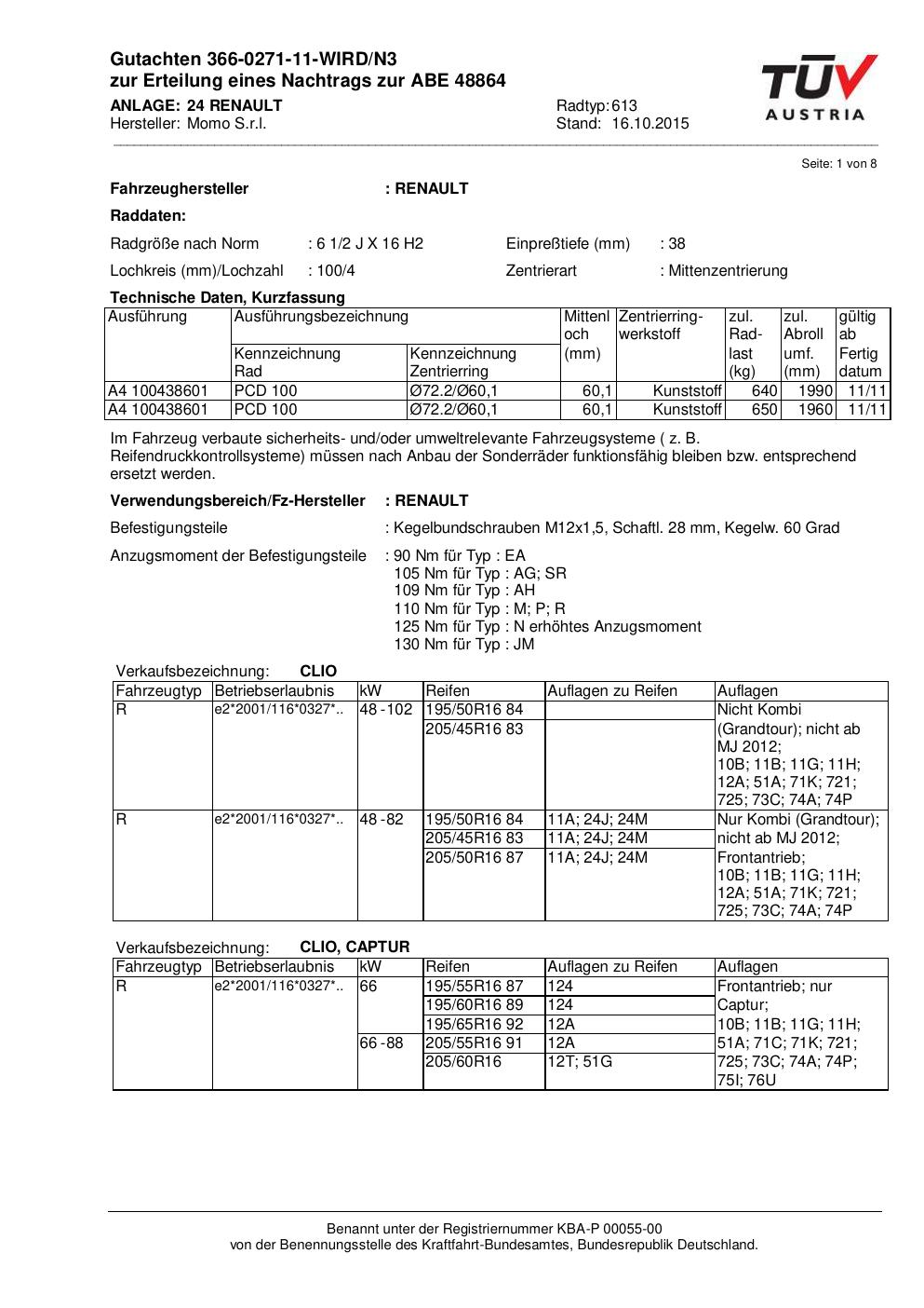 Felgengutachten / ABE für Alufelgen Momo WIN_PRO (6.5Jx16 ET 0, Mittenloch 0 mm) mit KBA 48864 (Zertifikatsnummer 366-0271-11-WIRD/N3__Anlage_24). Hier kostenlos als PDF herunterladen. Der Download-Link ist 24 Stunden gültig und kann bis zu zwei Mal verwendet werden.