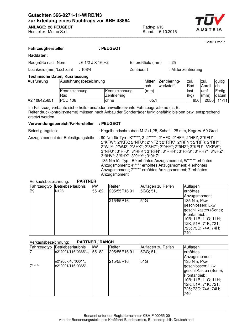 Felgengutachten / ABE für Alufelgen Momo WIN_PRO (6.5Jx16 ET 0, Mittenloch 0 mm) mit KBA 48864 (Zertifikatsnummer 366-0271-11-WIRD/N3__Anlage_26). Hier kostenlos als PDF herunterladen. Der Download-Link ist 24 Stunden gültig und kann bis zu zwei Mal verwendet werden.
