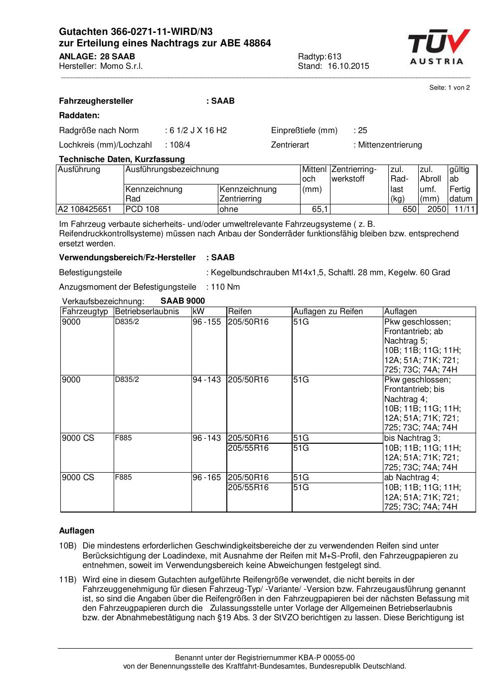 Felgengutachten / ABE für Alufelgen Momo WIN_PRO (6.5Jx16 ET 0, Mittenloch 0 mm) mit KBA 48864 (Zertifikatsnummer 366-0271-11-WIRD/N3__Anlage_28). Hier kostenlos als PDF herunterladen. Der Download-Link ist 24 Stunden gültig und kann bis zu zwei Mal verwendet werden.
