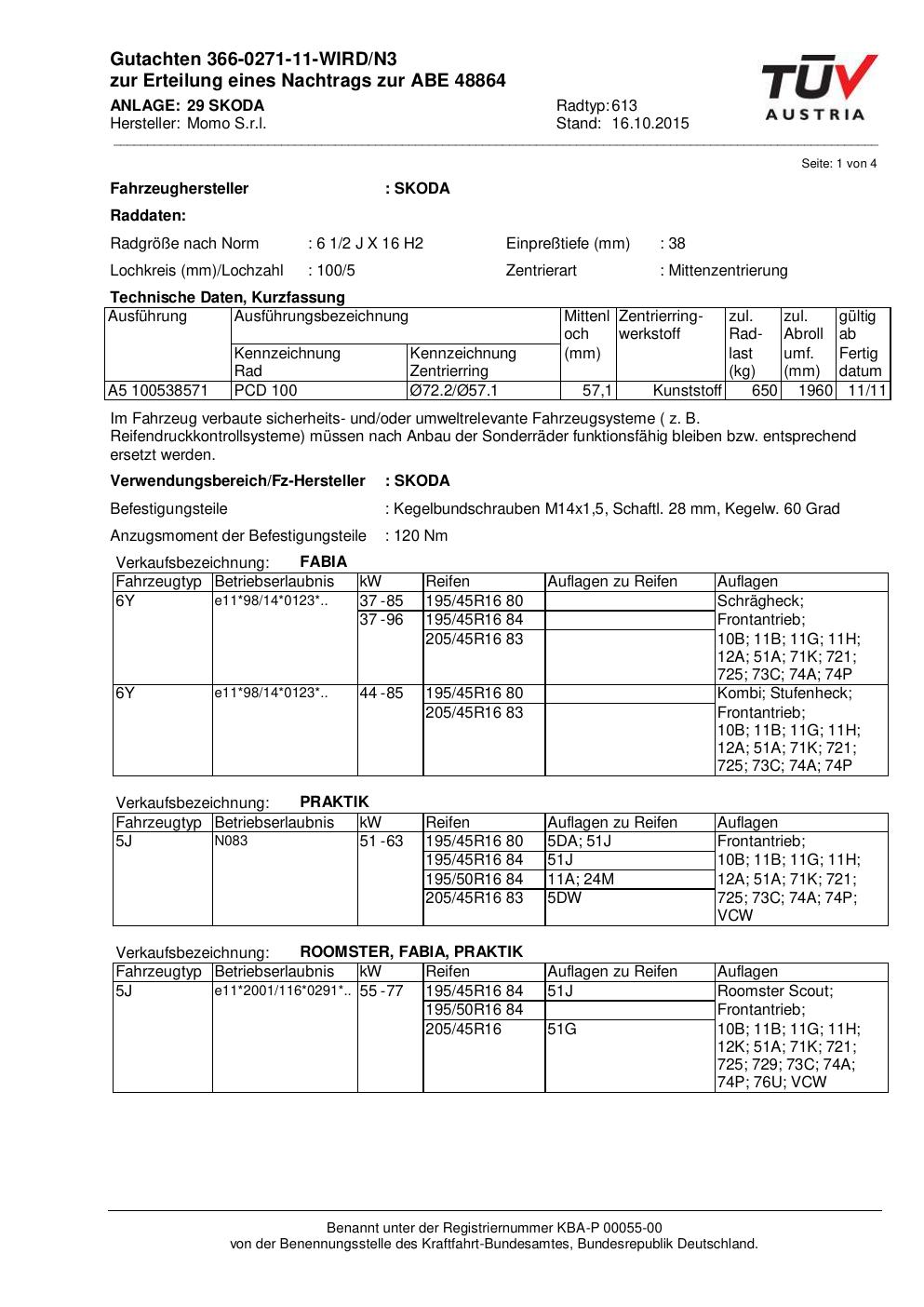 Felgengutachten / ABE für Alufelgen Momo WIN_PRO (6.5Jx16 ET 0, Mittenloch 0 mm) mit KBA 48864 (Zertifikatsnummer 366-0271-11-WIRD/N3__Anlage_29). Hier kostenlos als PDF herunterladen. Der Download-Link ist 24 Stunden gültig und kann bis zu zwei Mal verwendet werden.