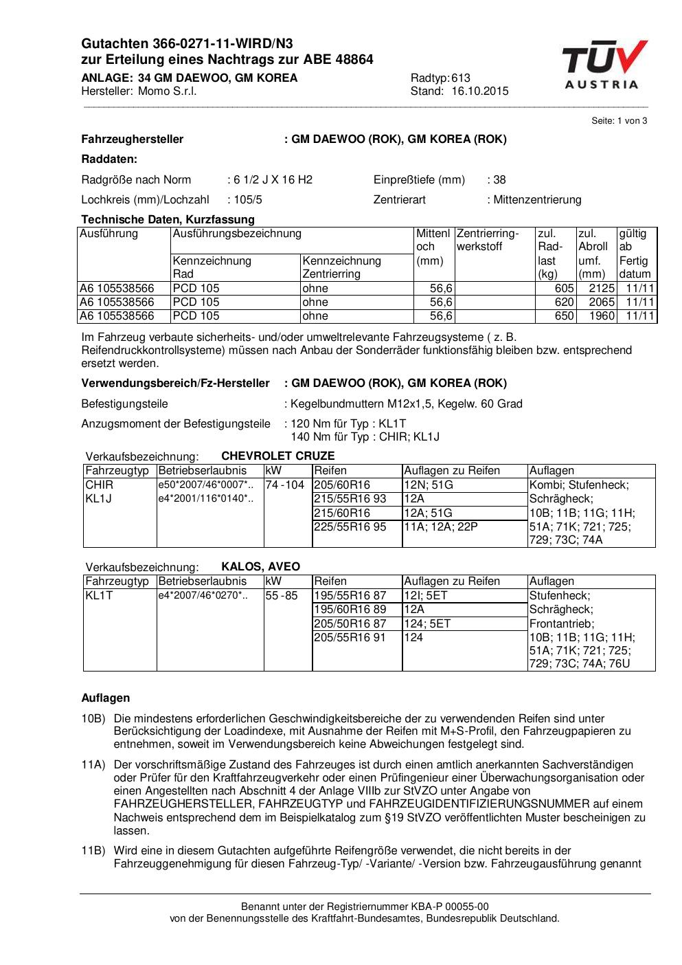 Felgengutachten / ABE für Alufelgen Momo WIN_PRO (6.5Jx16 ET 0, Mittenloch 0 mm) mit KBA 48864 (Zertifikatsnummer 366-0271-11-WIRD/N3__Anlage_34). Hier kostenlos als PDF herunterladen. Der Download-Link ist 24 Stunden gültig und kann bis zu zwei Mal verwendet werden.