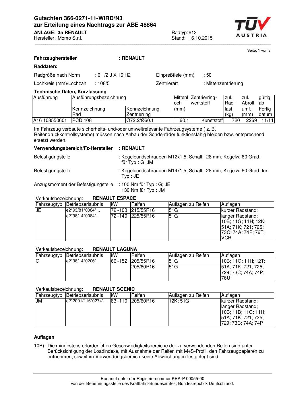 Felgengutachten / ABE für Alufelgen Momo WIN_PRO (6.5Jx16 ET 0, Mittenloch 0 mm) mit KBA 48864 (Zertifikatsnummer 366-0271-11-WIRD/N3__Anlage_35). Hier kostenlos als PDF herunterladen. Der Download-Link ist 24 Stunden gültig und kann bis zu zwei Mal verwendet werden.