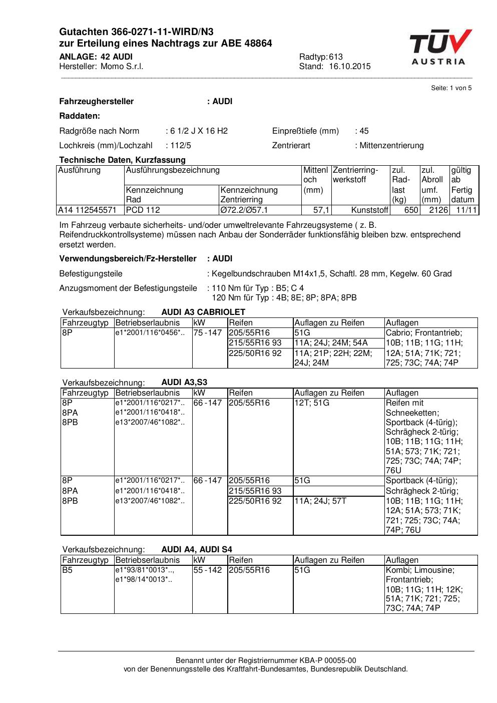 Felgengutachten / ABE für Alufelgen Momo WIN_PRO (6.5Jx16 ET 0, Mittenloch 0 mm) mit KBA 48864 (Zertifikatsnummer 366-0271-11-WIRD/N3__Anlage_42). Hier kostenlos als PDF herunterladen. Der Download-Link ist 24 Stunden gültig und kann bis zu zwei Mal verwendet werden.