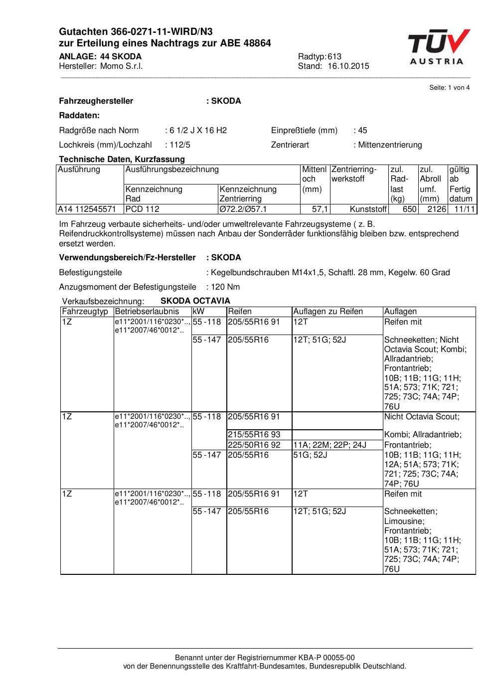 Felgengutachten / ABE für Alufelgen Momo WIN_PRO (6.5Jx16 ET 0, Mittenloch 0 mm) mit KBA 48864 (Zertifikatsnummer 366-0271-11-WIRD/N3__Anlage_44). Hier kostenlos als PDF herunterladen. Der Download-Link ist 24 Stunden gültig und kann bis zu zwei Mal verwendet werden.